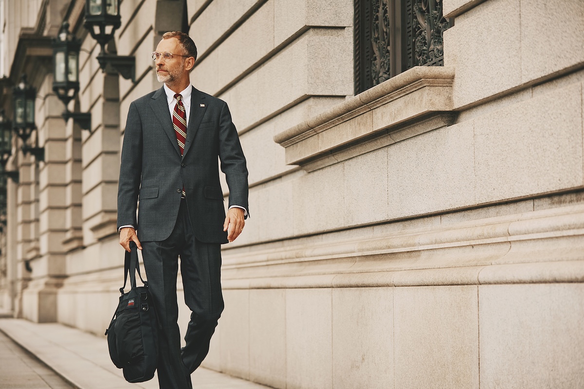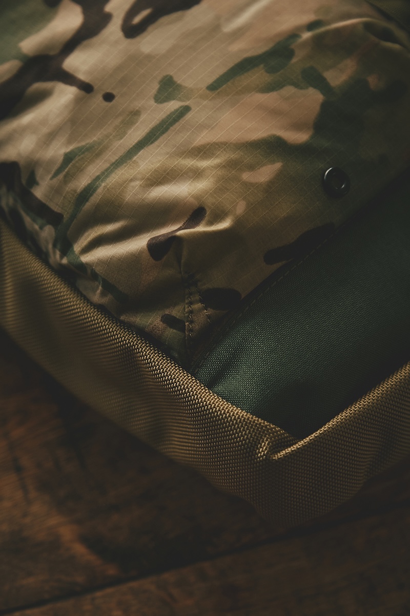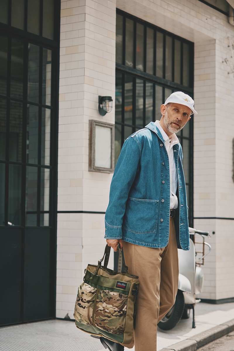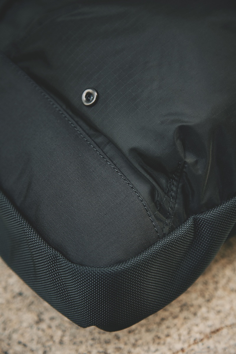 「ブリーフィング」の“ステルス”のボディーをベースに、「ブルックス ブラザーズ」のアイコニックなファンシャツに着想を得て異素材を組み合わせた。ヘルメットバッグの雰囲気は残しつつ、現代のライフスタイルに合うようPCスリーブやショルダーストラップを追加した。