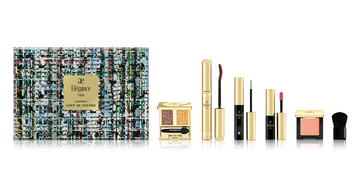 「エレガンス(ELEGANCE)」のメイクアップコフレは、ツイード柄が目を引くきらびやかなボックスにアイシャドウパレットやマスカラ、マスカラ下地、リキッドルージュ、チークの限定色を詰め込んだ。>記事の続きはこちら