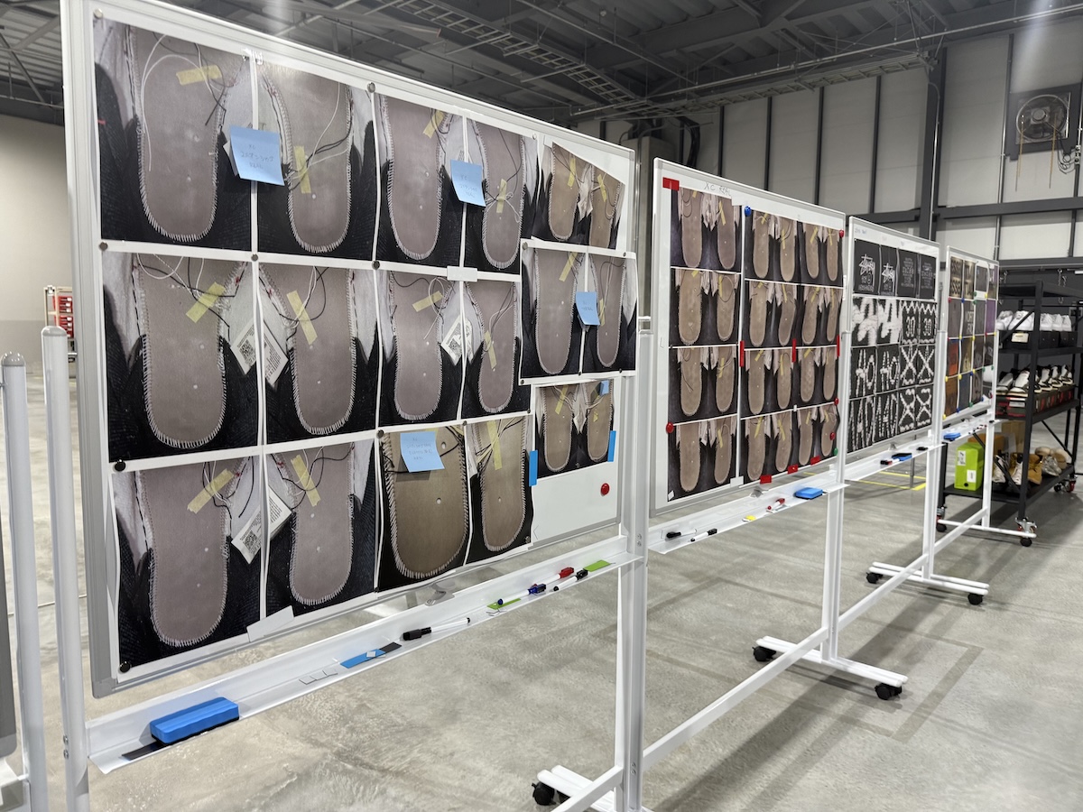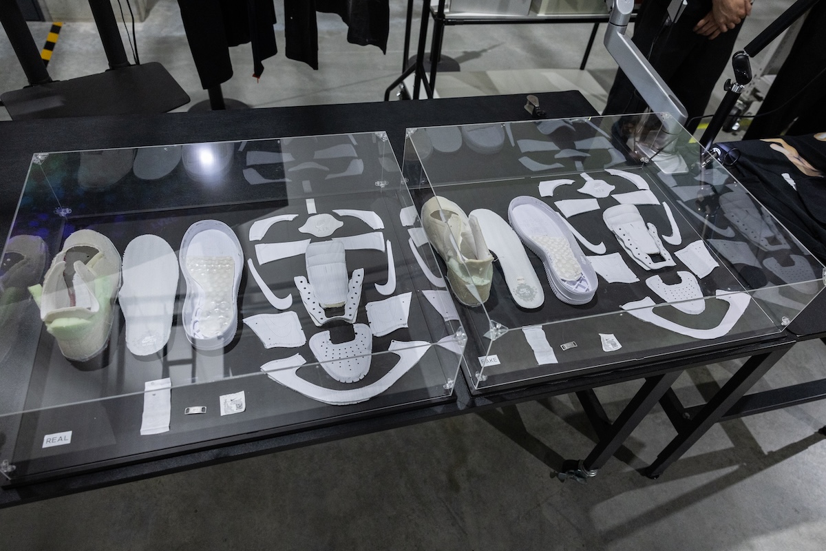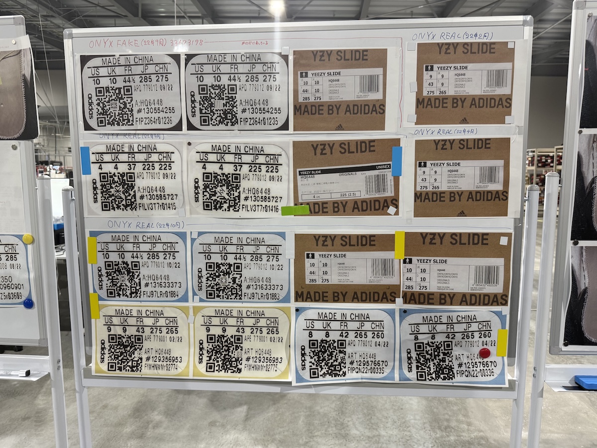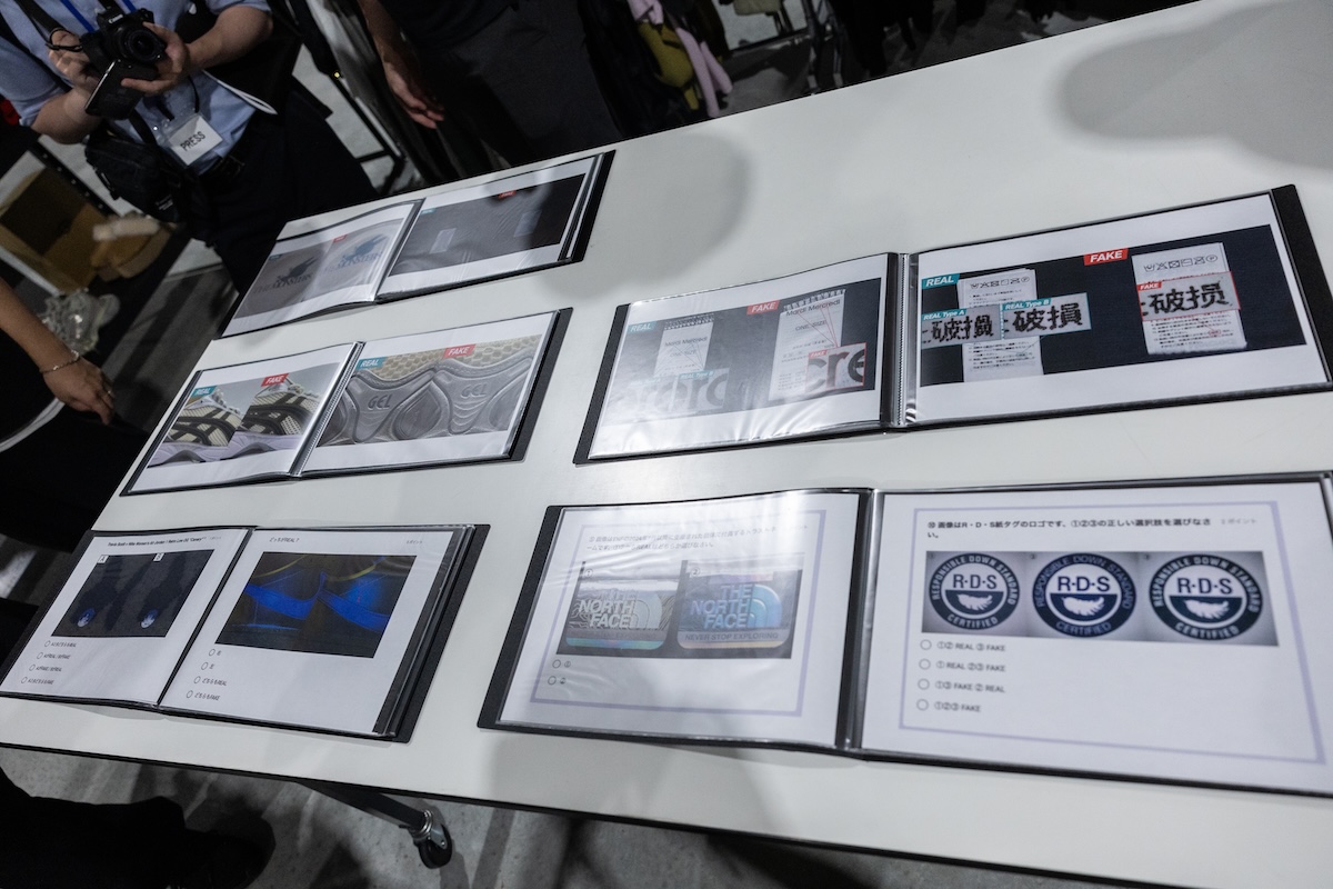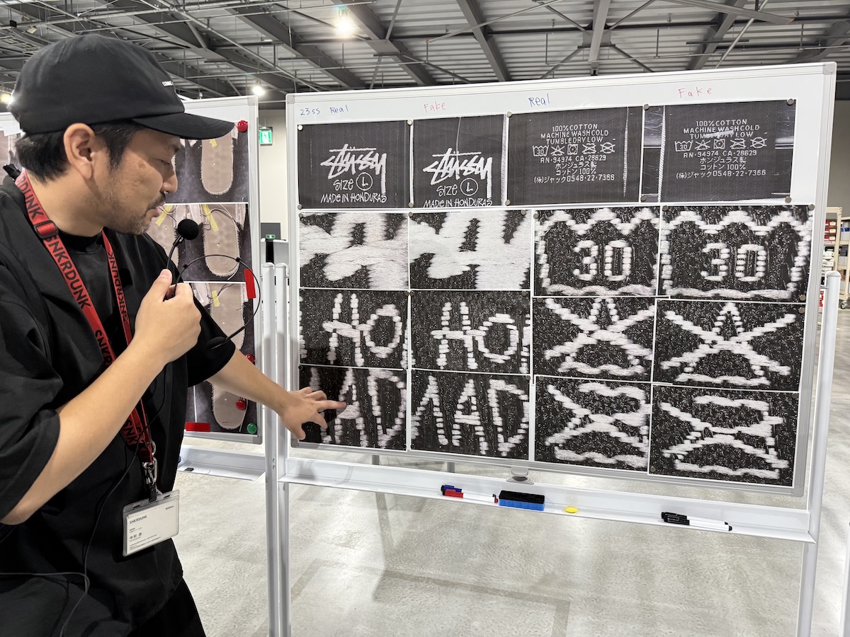スニーカーの場合、中国やベトナムなどに偽造品の工場が多くあるというが、「スニダン」はそれぞれの工場で生産されたスニーカーも比較。鑑定歴15年以上という「研究所」の中村渉所長は、「特にわかりやすいのが、中底の縫い目。さらに、スニーカーのシルエットや縫製の精密さなども工場によって異なる。それぞれの特性を知ることで、偽造品の見分けるポイントになる」。内タグのフォントやQRコードのデザイン、縫い目の間隔、デニムのブリーチ具合なども対象だ。最近では、「ミズノ(MIZUNO)」や「ウーフォス(OOFOSS)」の偽造品も増えているという。