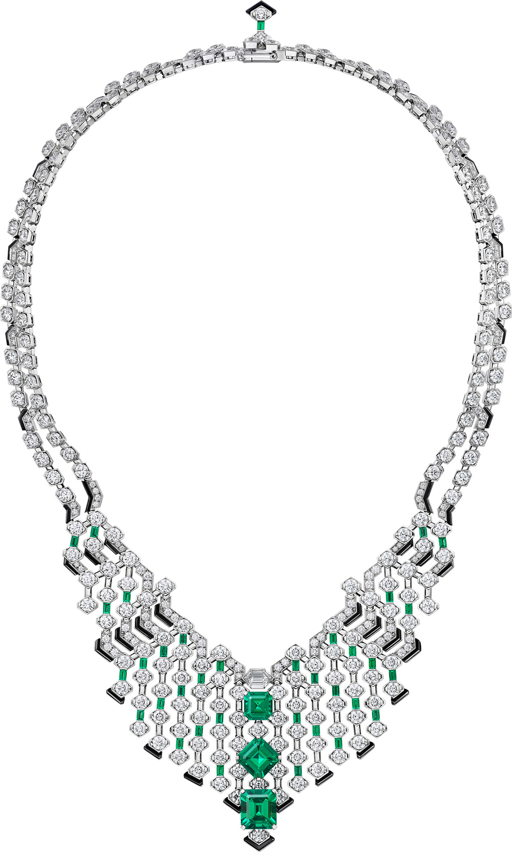 「カルティエ」の新作ハイジュエリーは、同ブランドの本領を発揮したコレクション。ボリューム、シェイプ、カラーなどでコントラストを利かせながら調和をもたらす、そのテクニックは「カルティエ」ならではだ。“トラフォラト”は、イタリア語の“トラフォラート”が由来で“オープンワーク”を意味する。まるで迷宮のように複雑なメッシュ構造が特徴で、3石のエメラルドを中心に、さまざまなカットのダイヤモンド、オニキス、エメラルドを左右対照にリズミカルに施して模様を描いている。一見シンプルだが、計算し尽くされたデザインと精緻な職人技が融合してこそ実現する立体感と躍動感、軽やかさがある。