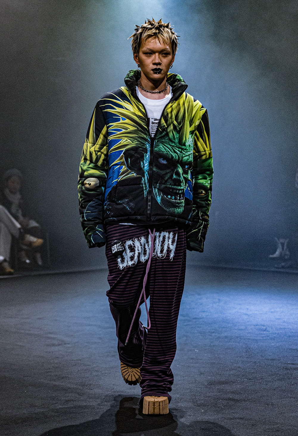 昨年立ち上げた「デッドボーイ」では、年に1度のコレクション発表を目標に掲げている。今年3月には学内選考を勝ち抜き、初のランウエイショーを披露。アメリカのホラー映画を題材に、ダメージ加工やコンピューターニット、自身のイラストを生成AIに読み込ませて制作したグラフィックなど、斬新なデザインで高い評価を得た。