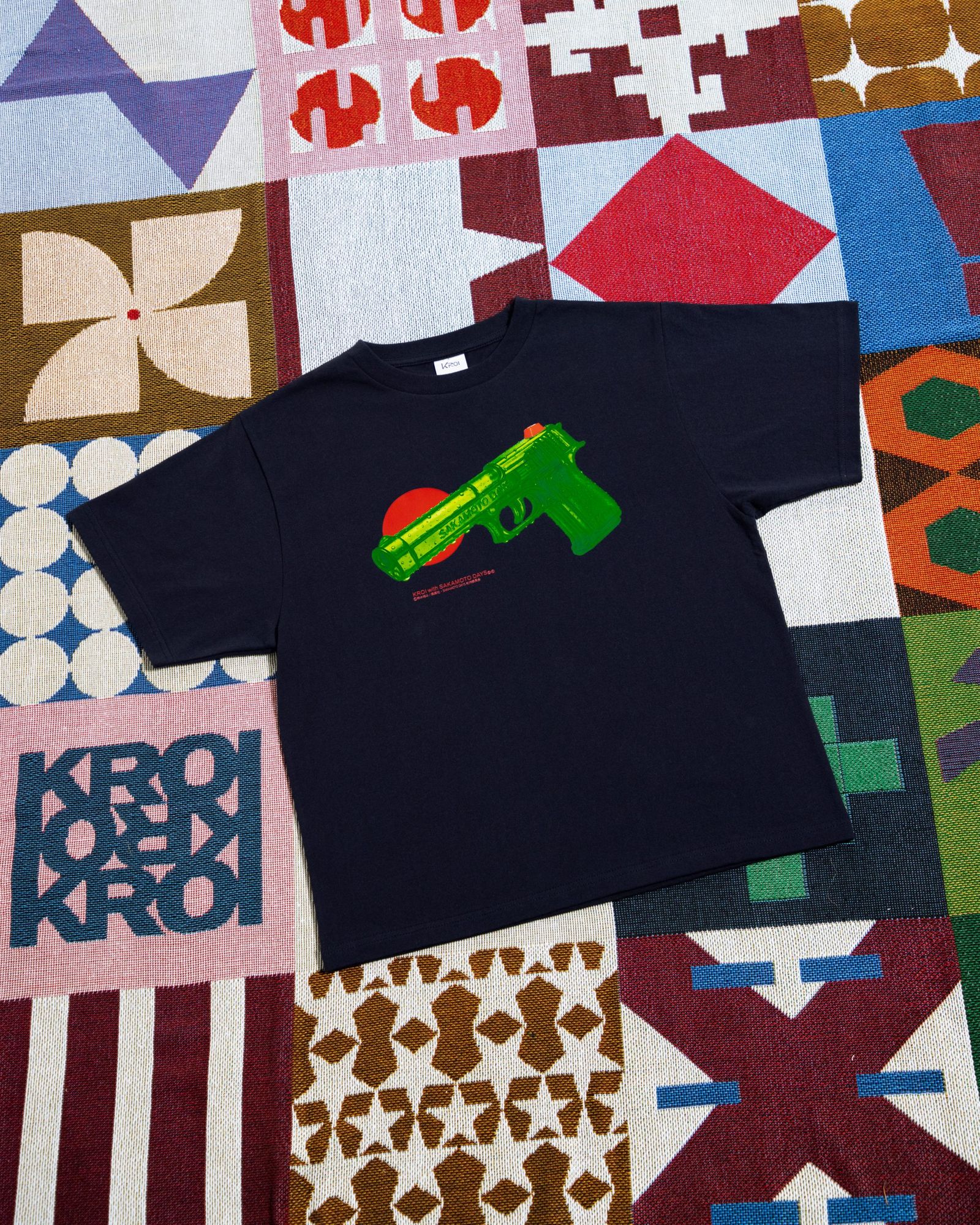 「SAKAMOTO DAYS」とコラボしたアイテムは、Tシャツ(2種、各5000円)とステッカー(900円)だ。アニメの世界観をKroiに落とし込み、アイコニックな拳銃などのイラストを施した。