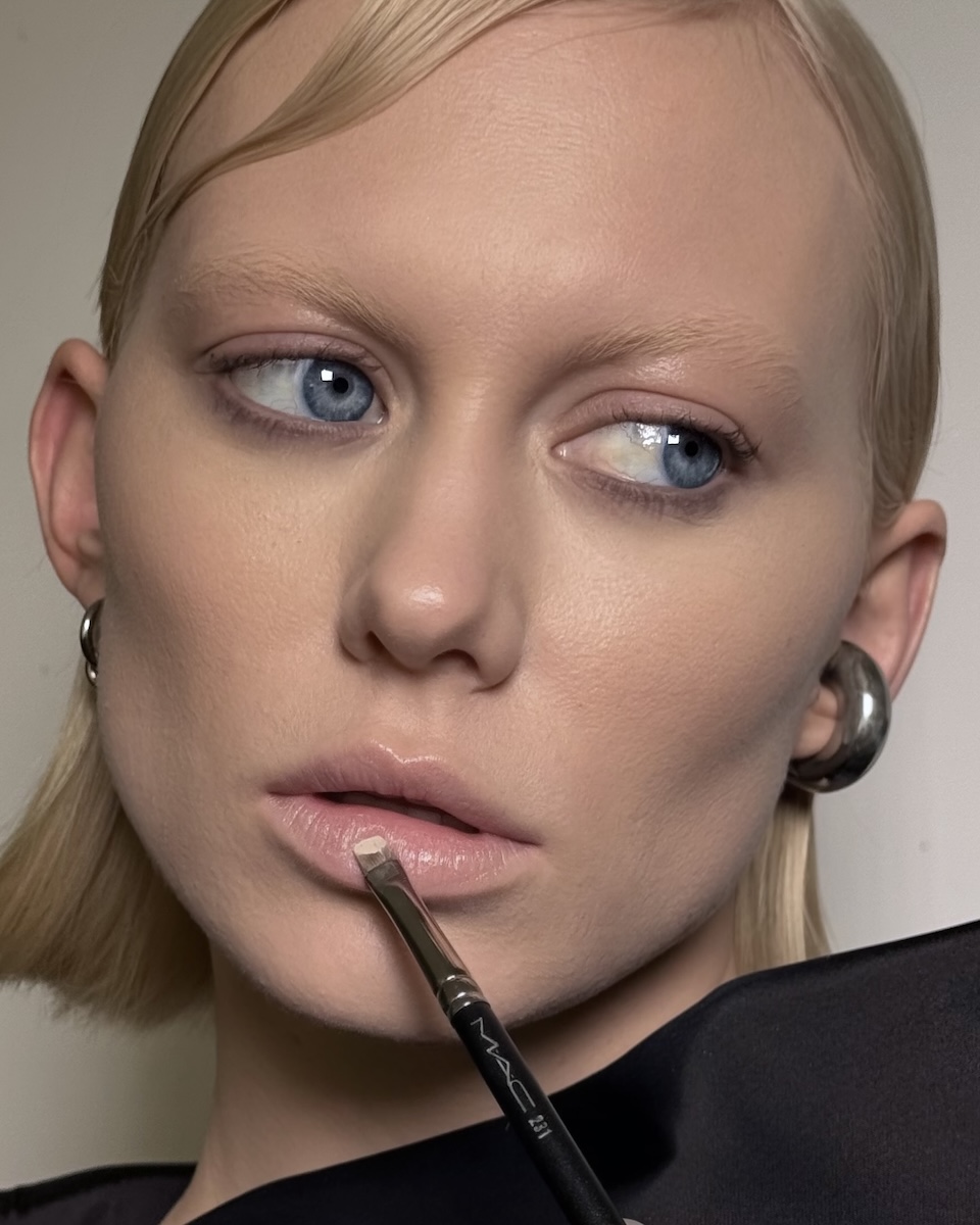 肌のトレンドは、フィルターをかけたように滑らかで均一な“マネキンスキン”。マネキン風のセミマット肌に作り込みながらも、薄膜で仕上げ、人間味のある血色感を残すのがポイントだ。同系色のヌードカラーを重ね、ハイライトは控えめに効かせた。