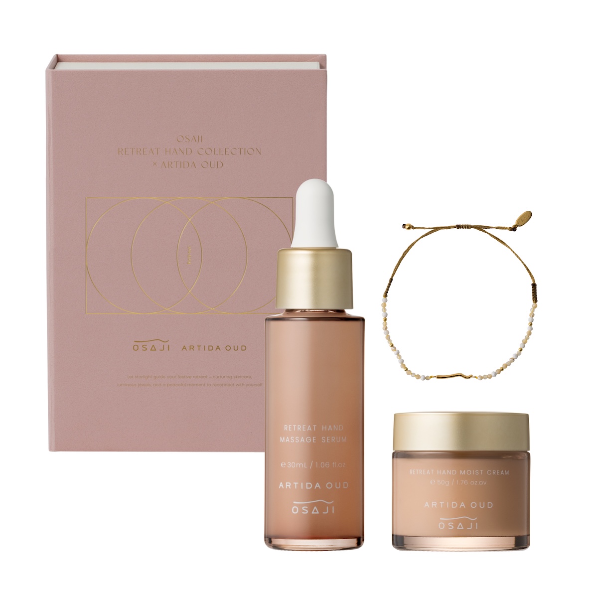“ハンド マッサージ セラム”(30mL)と“ハンド モイスト クリーム”(50g)は、限定調香・デザインのハンドケアアイテム2種と、ブレスレットをセットした。11月5日に「オサジ」直営店舗と公式オンラインショップで予約受付を開始し、12日に両ブランド店舗および公式オンラインショップで発売する。