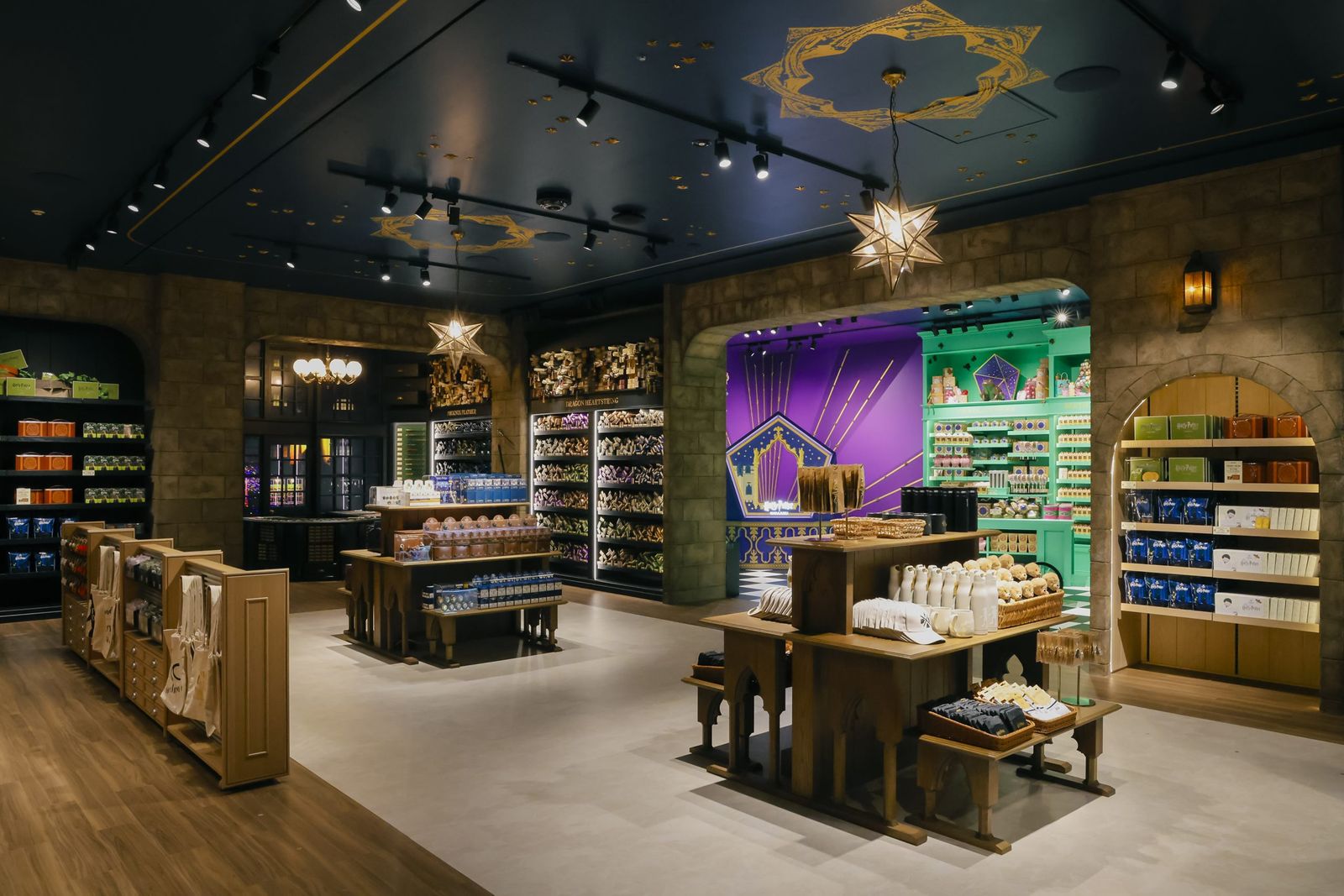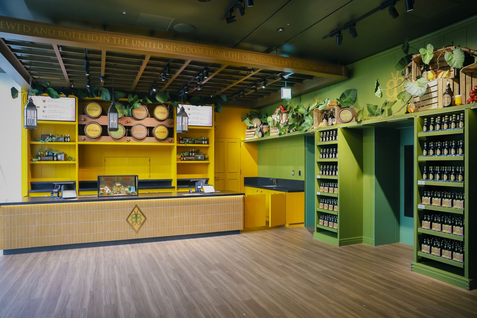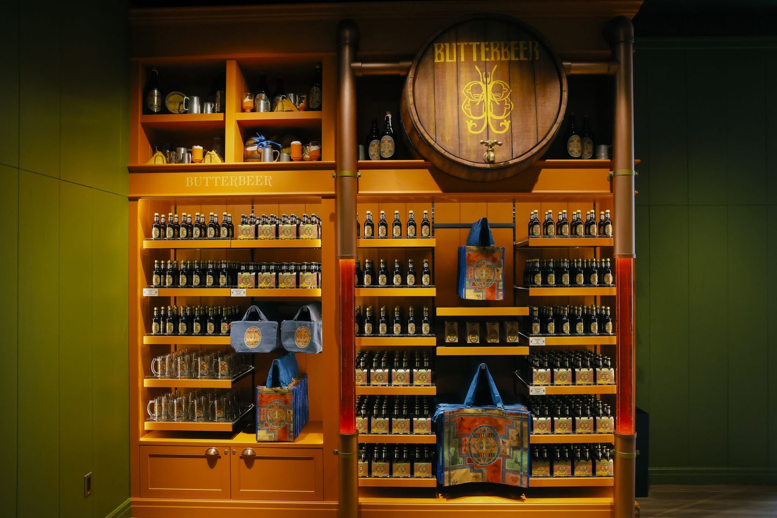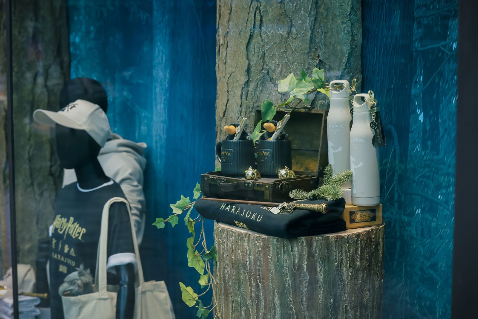 「ハリー・ポッター ショップ 原宿」の店内は、物語の舞台となるホグワーツ魔法魔術学校の敷地内に広がる“禁じられた森”をコンセプトにした内装で、限定グッズや魔法アイテムを販売するほか、ハリー・ポッターシリーズに登場する甘いドリンク“バタービール”を提供するバーも併設した。