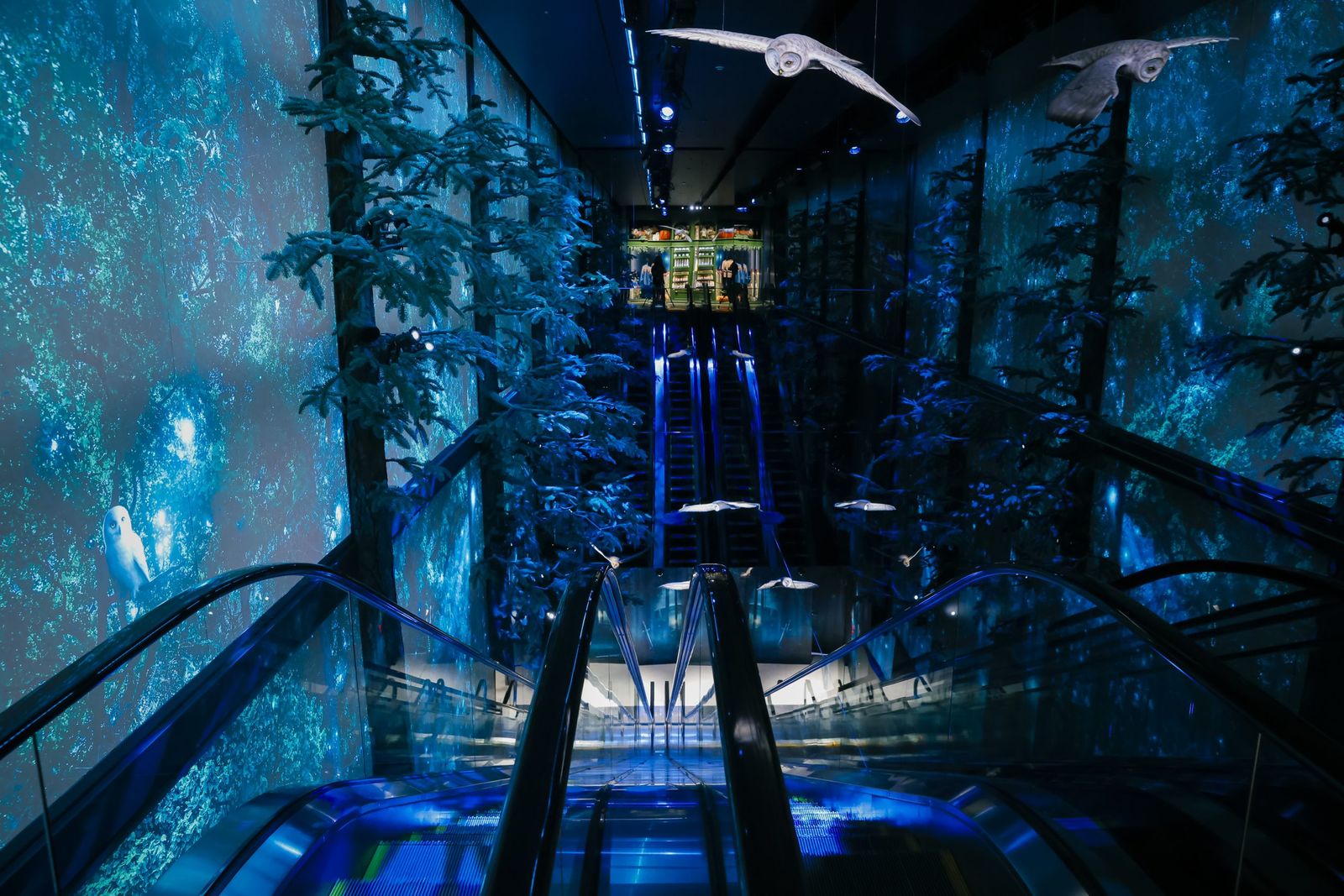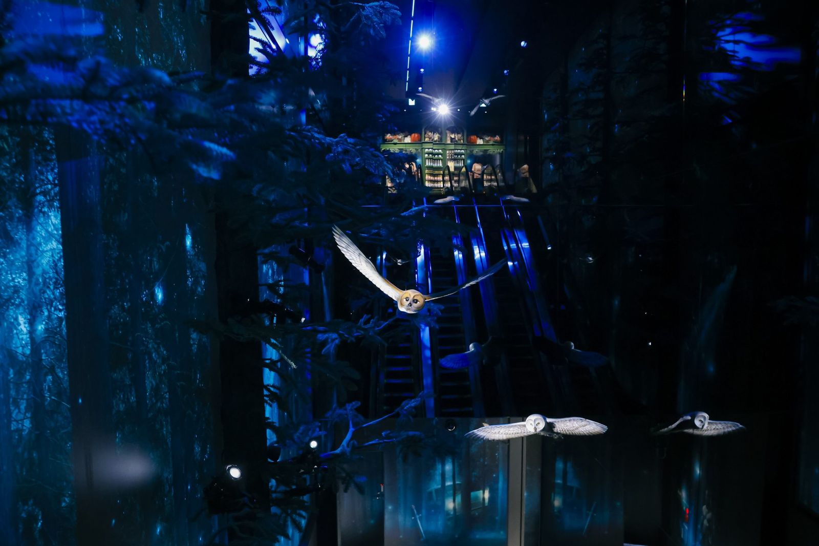 個人的にテンションが上がったのは、1階から2階へと続くエスカレーターだ。“禁じられた森”に迷い込んだようなトンネルで、そこはもう別世界。薄暗い空間に足を踏み入れた瞬間、思わず「ルーモス!」と灯りの呪文を唱えたくなるほどの没入感だ。