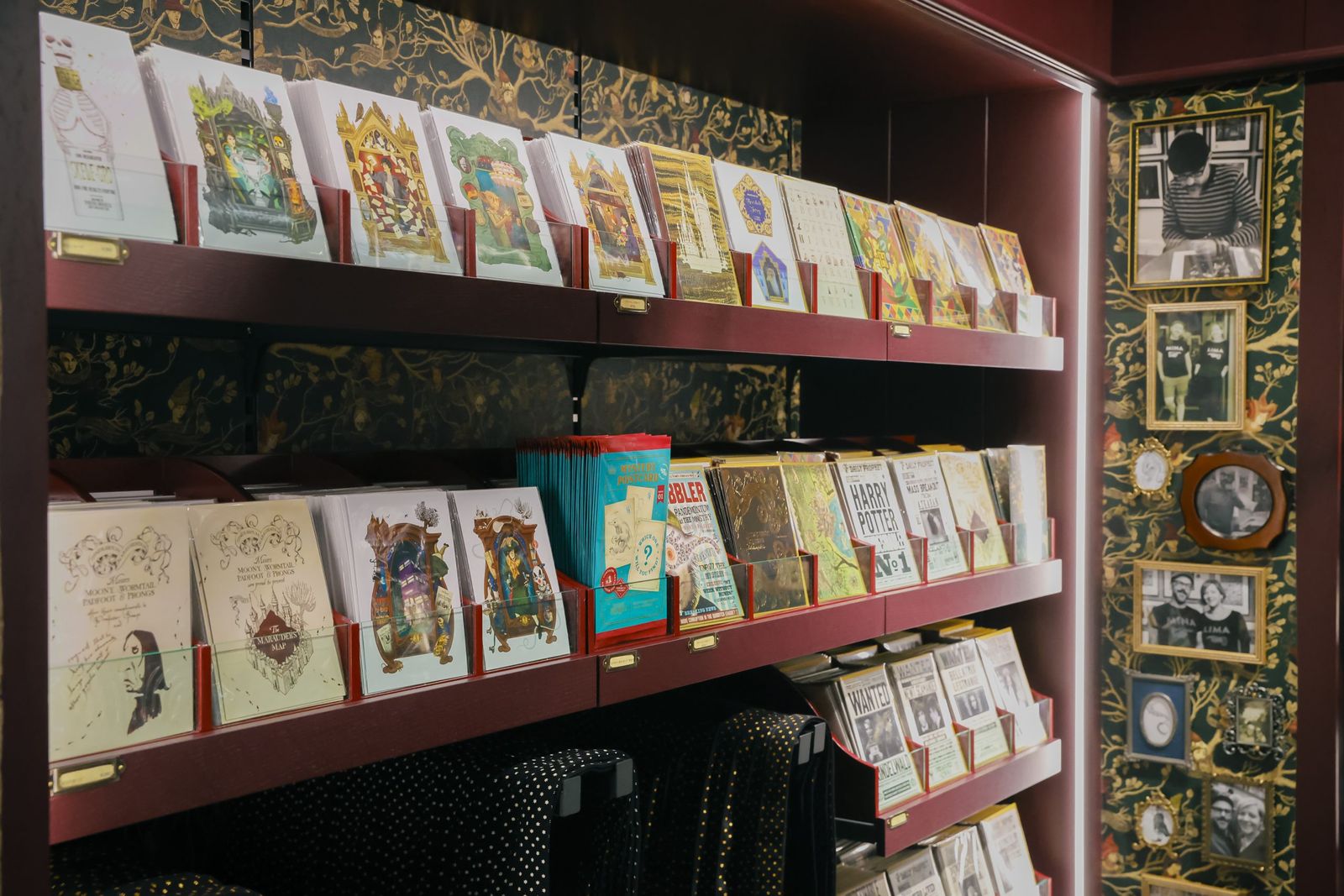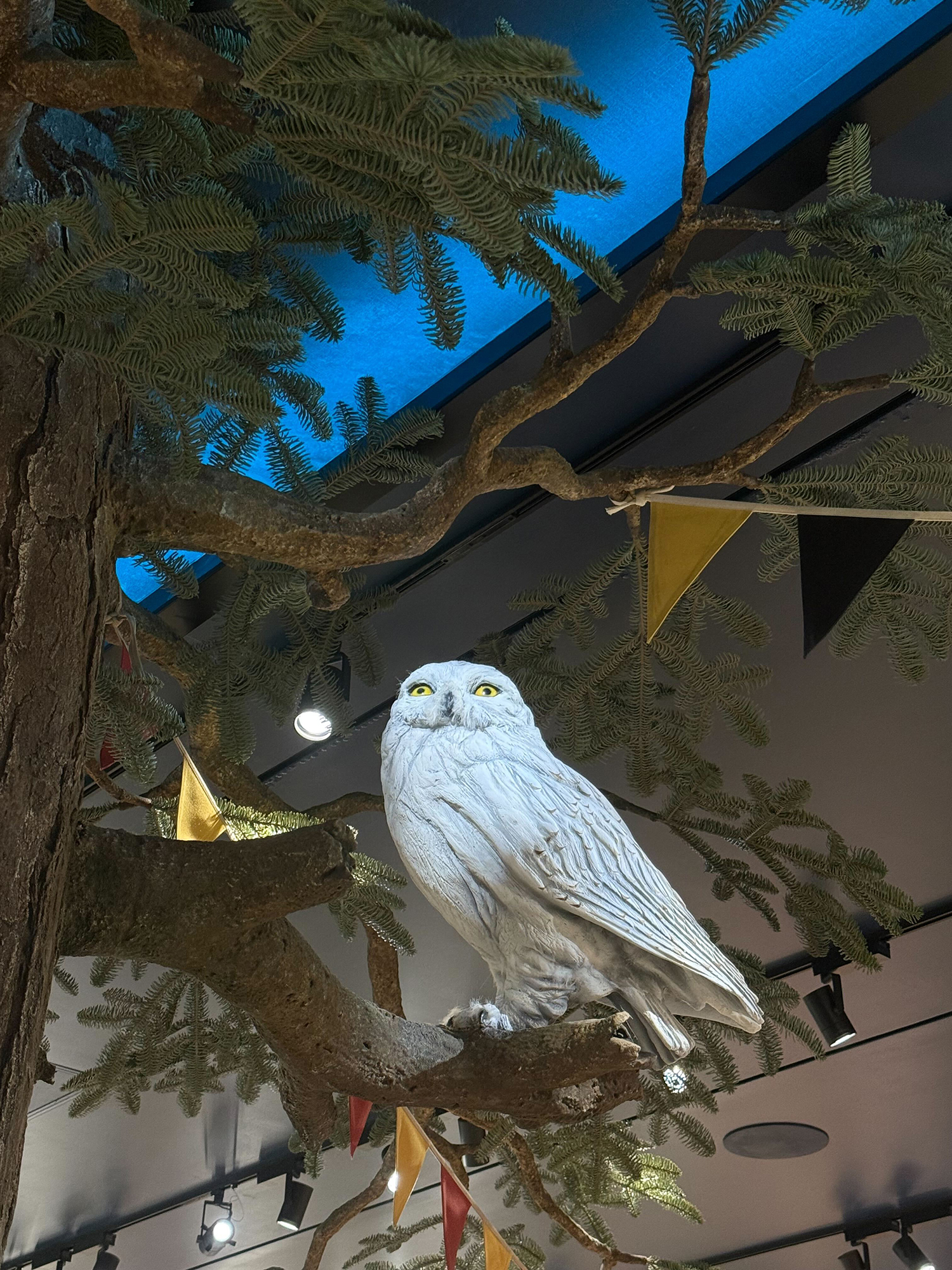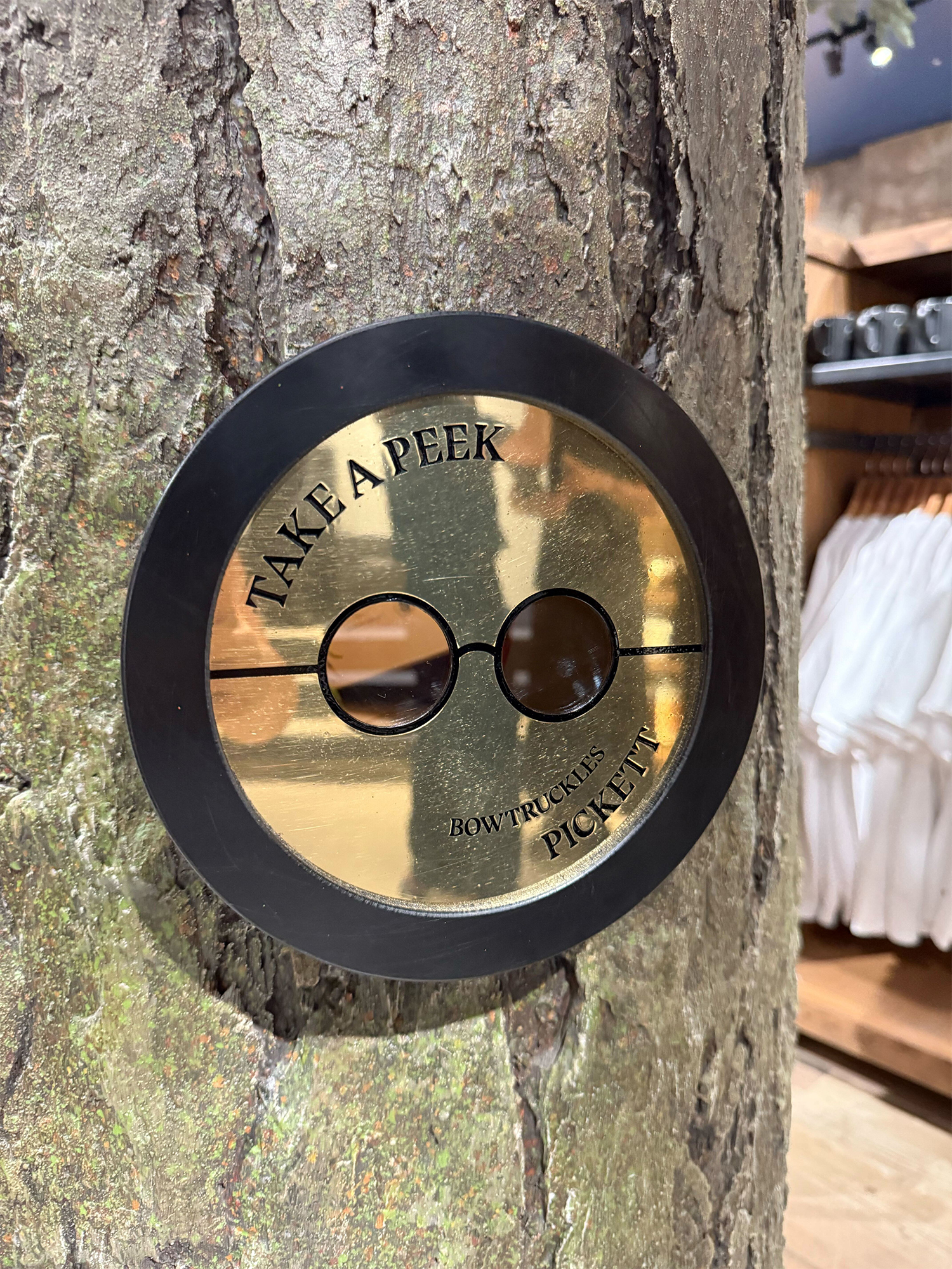 見上げると木の上にはヘドウィグが、木の中を覗けるギミックには小さな魔法動物のピケットがいたりと、単なるショップにとどまらず、魔法界に入り込んだような感覚を味わえる空間設計になっている。製品に目が行きがちだが、細部までこだわっている内装にも注目してほしい。
