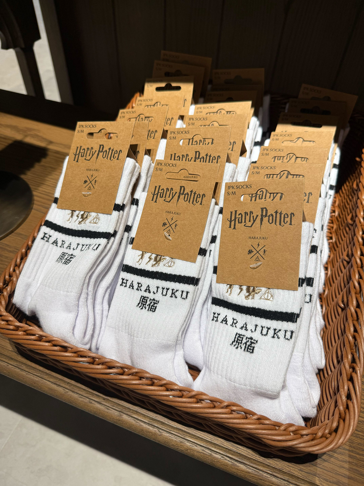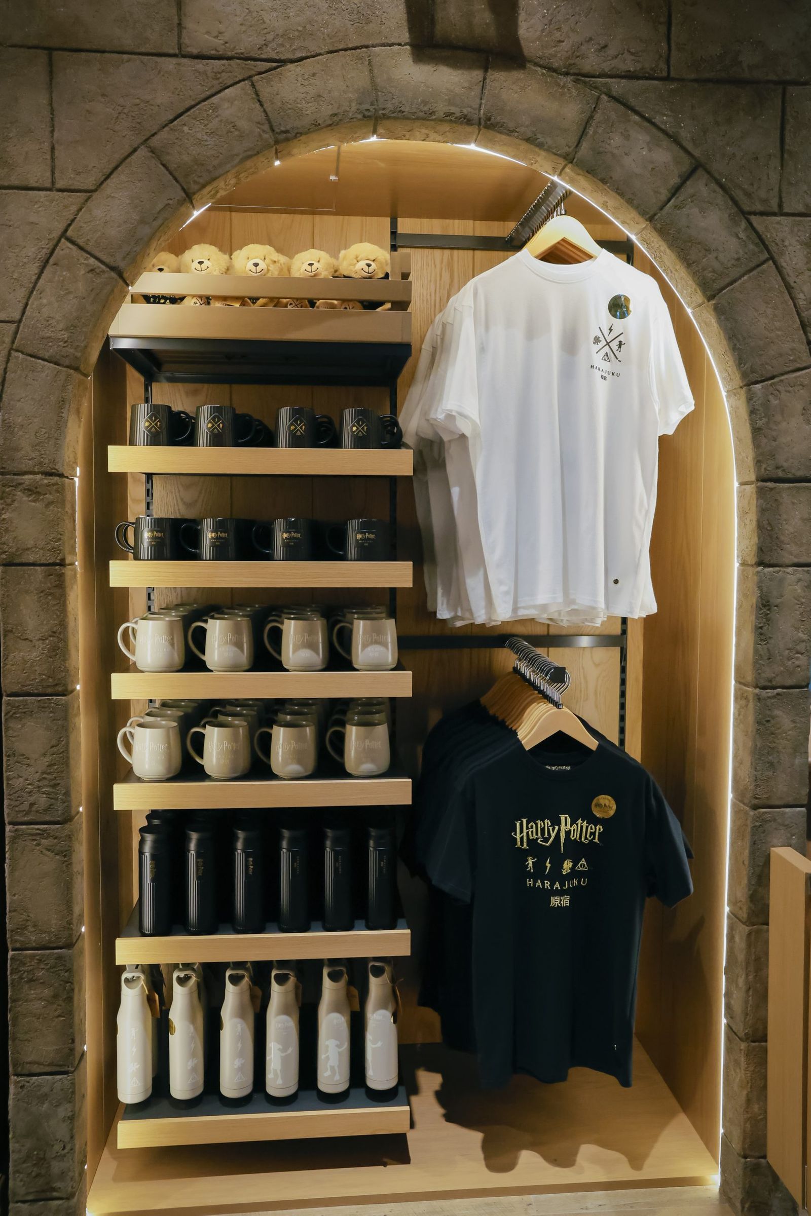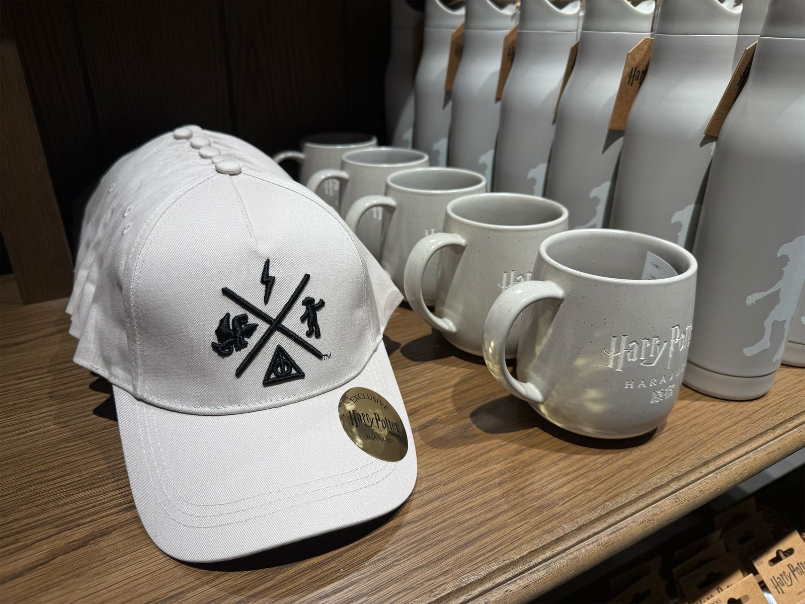 それぞれのアイテムに共通して、ハリー・ポッターのロゴと作品を象徴する4つのアイコンが施されているほか、特別感を演出する「原宿」「HARAJUKU」の文字も刻印。白やブラックをベースにしたデザインで、年齢、性別問わずに使えそうだ。1階にはほかにも、ホグワーツの4寮(グリフィンドール、ハッフルパフ、レイブンクロー、スリザリン)のアパレルアイテムや雑貨、お土産にピッタリなお菓子なども用意している。