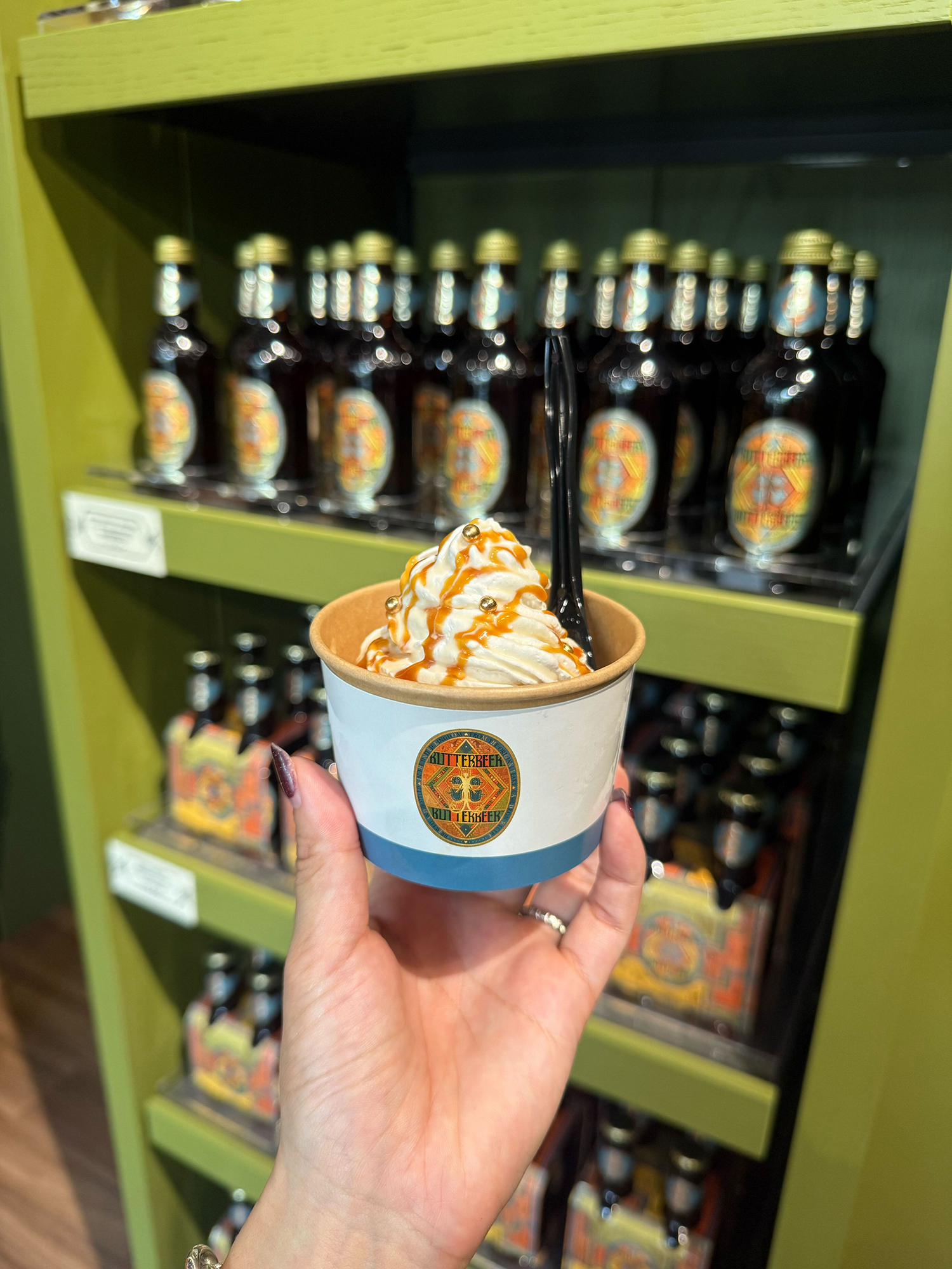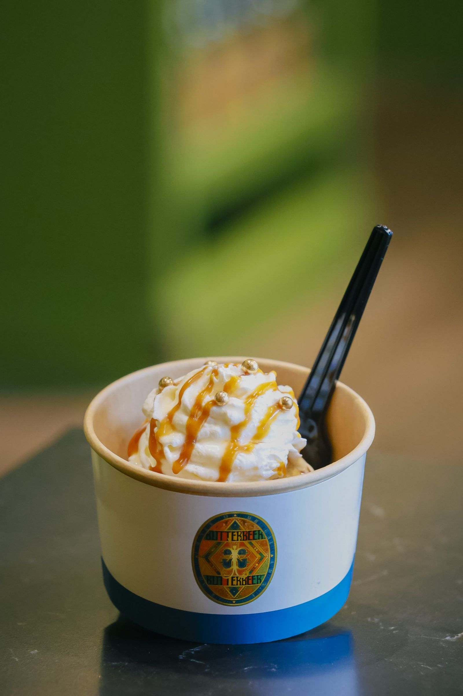 記者は、“バタービールアイス”を試食した。バタースコッチのような“バタービール”フレーバーのアイスの上には、ホイップクリームとキャラメルソース、トッピングにカリカリとしたアラザンが散りばめられている。一口食べてみると、ほろ苦く香ばしいキャラメルソースと“バタービール”の甘みがほどよくマッチ。子どもも食べられる味わいで、暑い夏には最適だ。コーンではなく、手が汚れないカップ提供もうれしい。