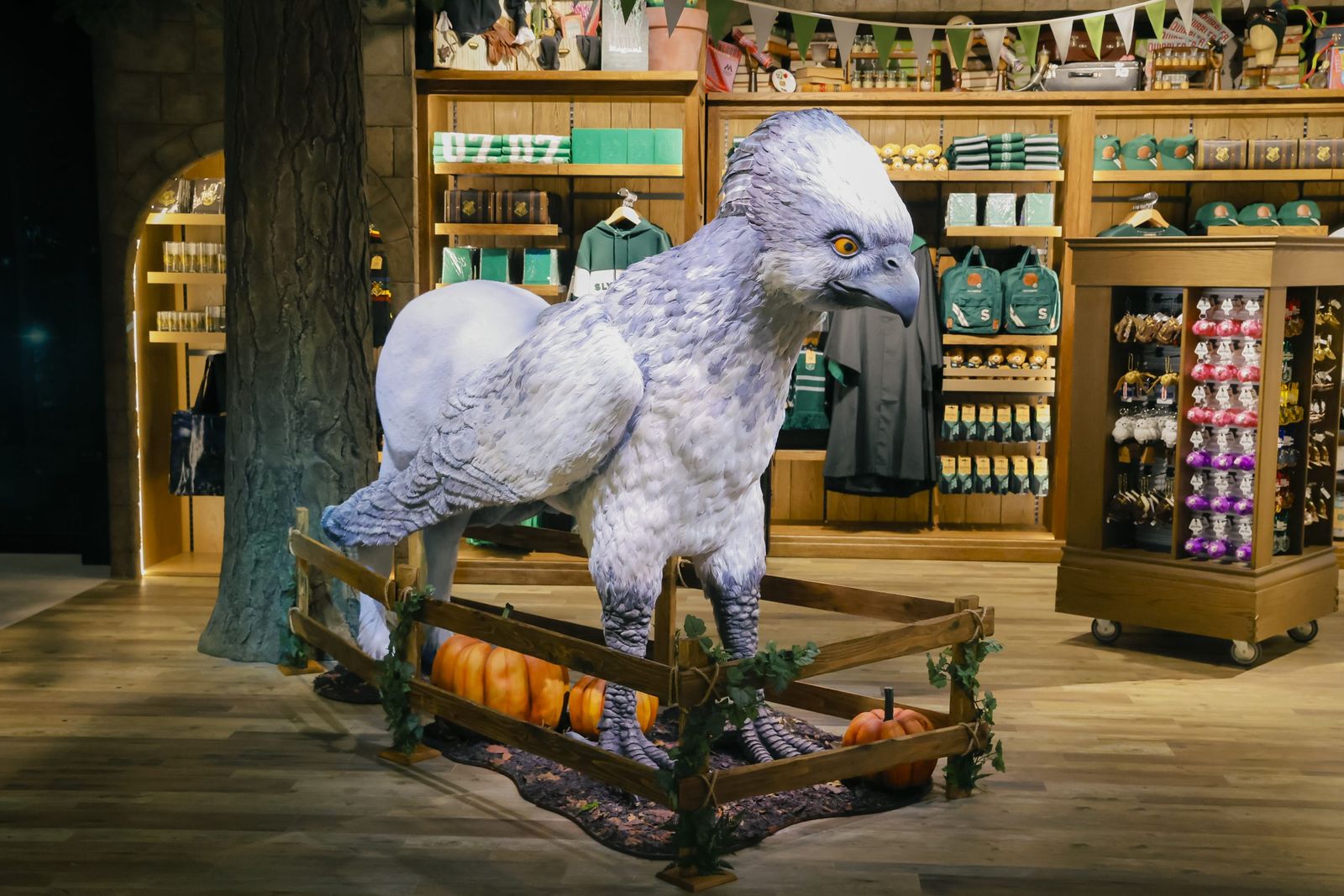 店内奥へ進むと、3作目「ハリー・ポッターとアズカバンの囚人」に登場する魔法生物・バックビークが登場。こんなに間近で見られるのは、恐らくここ「ハリー・ポッター ショップ 原宿」だけ。映画制作に携わったチームが製作したというだけあって、羽の一本一本まで精巧に作られている。今にも動き出しそうな迫力だ。