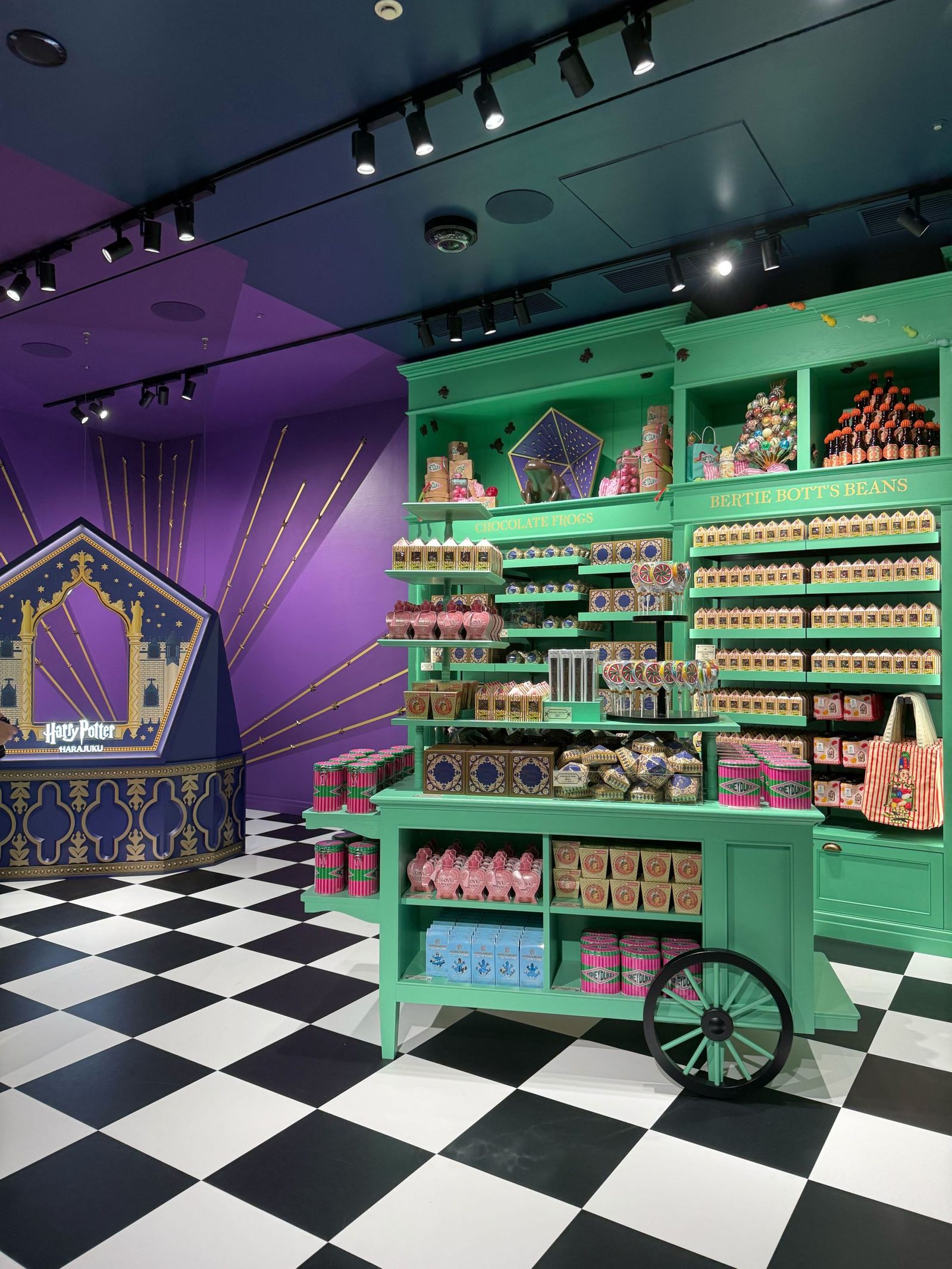 「ハニーデュークス」には、百味ビーンズやカエルチョコなどの映画に登場するおなじみのお菓子が。カエルチョコの巨大フォトスポットもあり、トレーディング・カードの登場人物になりきって写真を撮ることもできる。
