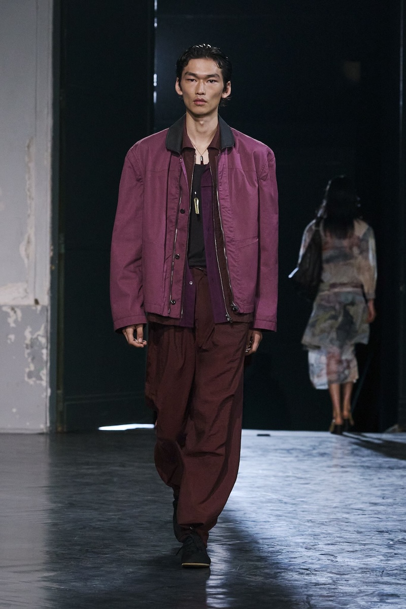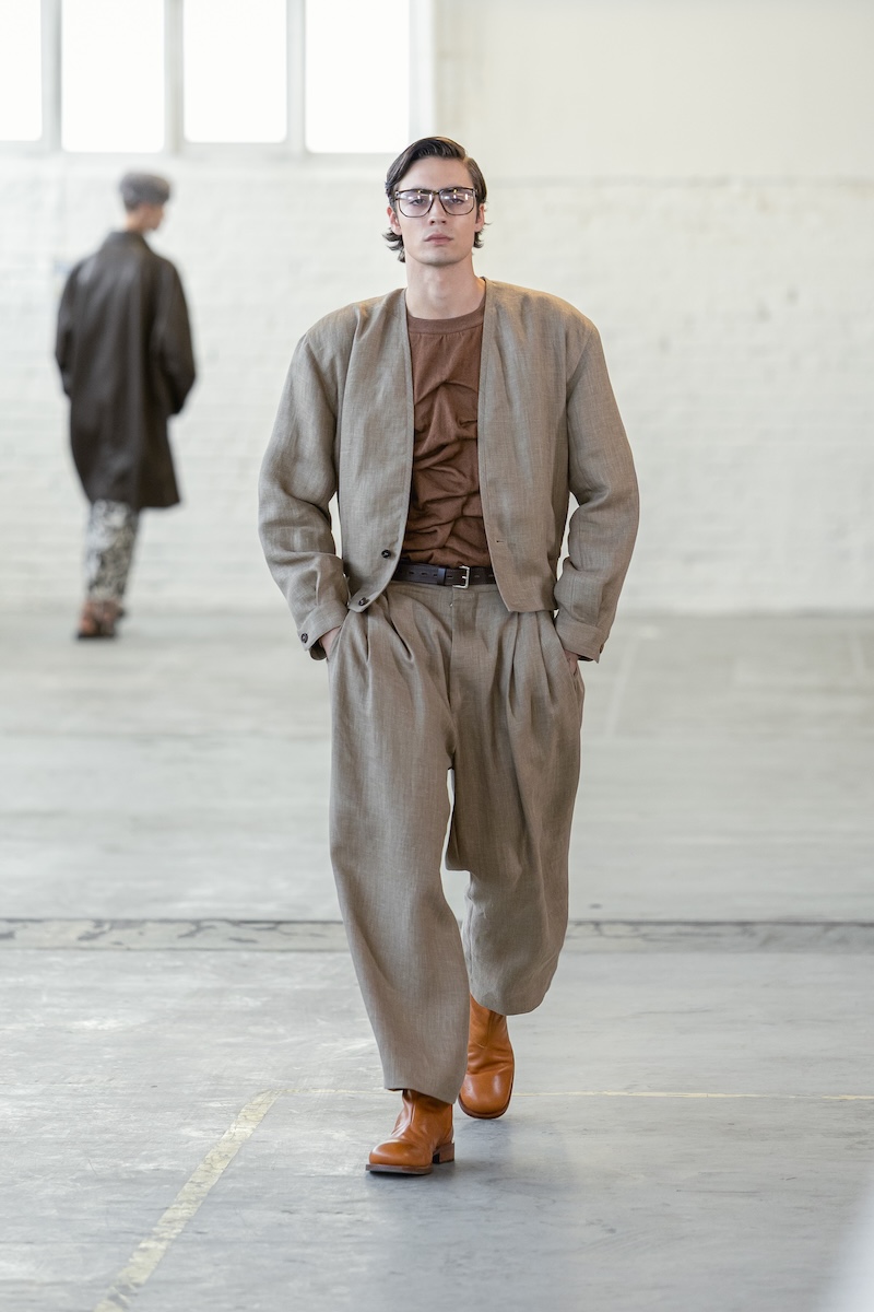 村上:雰囲気、ちょっと変わりましたよね。以前はとにかく巨大で、ある意味「シェルター」とか「モニュメント」的な感覚の洋服だなぁ、と思って見てきましたが、そろそろ極端なオーバーサイズのシルエットは終焉ムード。ゆえに、かどうかはわかりませんが、序盤のシルエットは随分現実的になりました。今シーズンは、ゴブランや地厚のリネン、伝統的なスーツ地など、レトロなムードが漂う生地を多用し、仕立ての良さがわかる程度のボリューム感にまとめました。肩の力はだいぶ抜けた印象です。ただ、まだ「『ヘド メイナー』の人」になってしまう印象で、「『ヘド メイナー』を着ている人」になるには、もう極端なシルエット以外の“何か”が必要な印象です。朝イチの「ルメール」は、そこにアティチュードや佇まい、生き方、価値観などのムードを盛り込んでいるけれど、「ヘド メイナー」はそんな付加価値を何に設定して、それをどう盛り込んでいくのでしょう?
