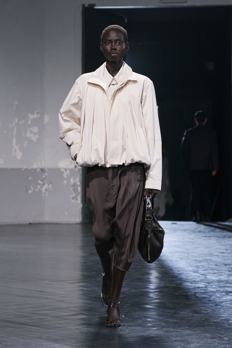 今季の「ヘド メイナー(HED MAYNER)」は、“脱・構築”という言葉がまさにしっくりきます。フォーマルな装いをベースにしながらも、ジャケットの肩はストンと落ち、パンツは腰で緩やかに括られ、シャツの襟はねじられている。モデルの動きに合わせて自然に生まれるシワやズレがそのまま美しさとなり、「着ること自体がスタイリング」と言いたくなるような服でした。服そのものはミニマルですが、そのアプローチは「ルメール」の静けさとも異なり、より身体の感覚に根ざした造形を追求した、哲学的な服にも感じました。