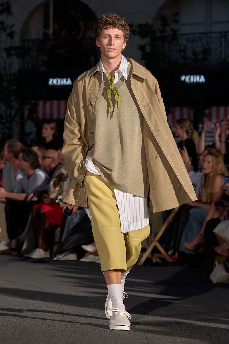 自信のある男女による今シーズンのスタイルは、ノンシャラン(気取らない様を表す言葉)なスタイリングや即興的なレイヤードがハマりましたね。幅広ラペルのチェスターコートには、コットンポプリンで軽やかなシャツ&ショートパンツ。普通ならもっとエレガントなコーディネートをするのでしょうが、これがノンシャランや即興的と表現したくなる所以。でもシンプルかつ端正なシルエットなので、カッコ良いんです。描くのは「オシャレはガマン」というほどファッション・アディクトではない男女なので、組み合わせるアイテムはビスコースやシルクツイルなど、柔らかく肌を撫でるような素材使い。スカートの一部は生地をたくし上げているので尚更、歩くたびにドレープが揺れ、美しく涼やかです。ミラノでは「ブリオーニ(BRIONI)」で同じことを感じましたが、これだけ暑いと、柔らかな生地が足の脛の辺りを撫でながら“たわんでいる”様子って、すごく良いですね。「あぁ、涼やかな素材に体を撫でられているんだろうなぁ」という印象を抱かせます。