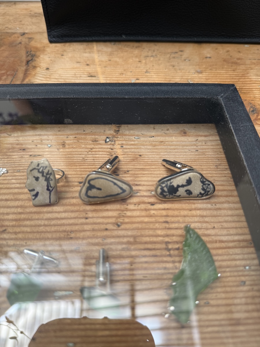 村上:私は「アニエス ベー(AGNES. B)」の展示会へ。シアサッカーのセットアップや、ノーラペルのジャケット、開襟シャツにグルカサンダル、さまざまなラフィア素材のアクセサリーなど、涼やかなフレンチスタイルが並びます。抹茶グリーンやスカイブルーなど、鮮やかな色合いもポイント。ですが、私のお気に入りは、拾った石で作った指輪です(笑)。石に思い浮かぶ柄をフリーダムに描いて、なんと指輪に。同じアイデアで作った貝殻のブローチもありました。材料費はそんなにかからないけれど、手間暇は意外とかかるヤツ(笑)。全世界で100個くらい作れるかな?って感じらしく、案外争奪戦になるかも!私は、1つ買います(買えるかなw?)。