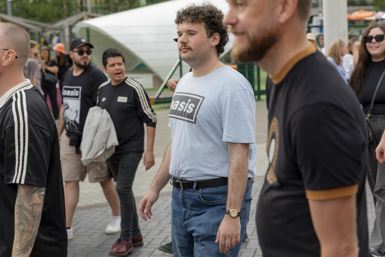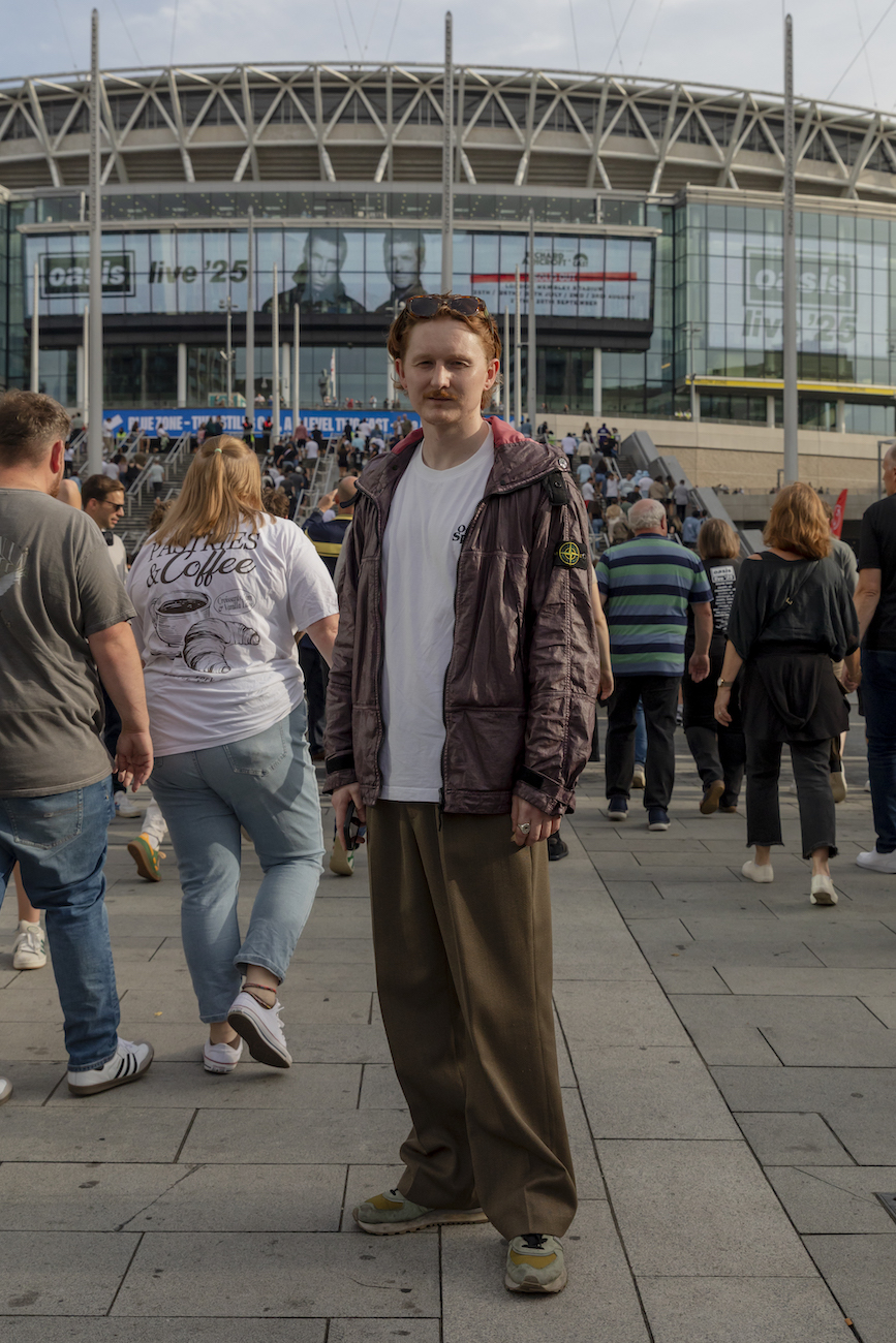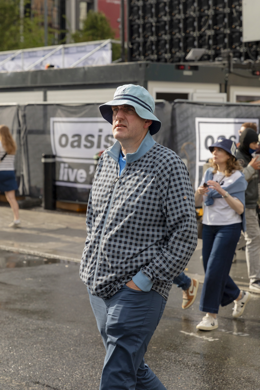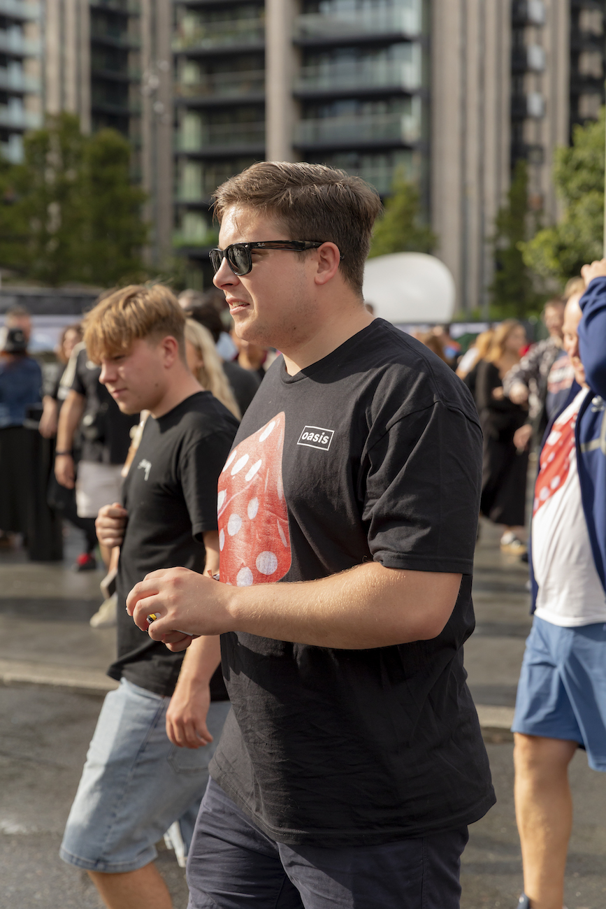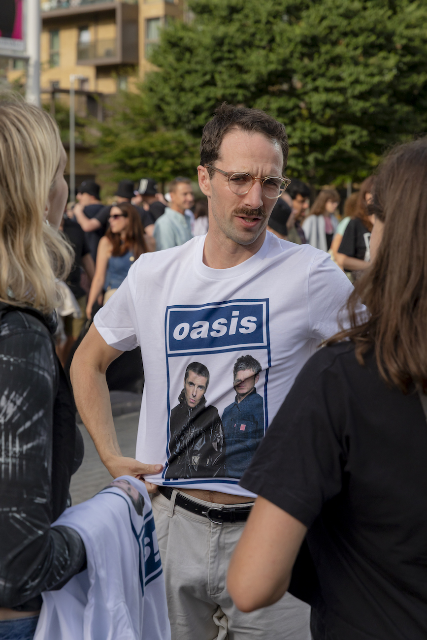 そして、上記の公式マーチャンダイズをベースとしたブロークコア風のスタイルを中心に、リアムが手掛けるブランド「プリティー・グリーン(PRETTY GREEN)」のアイテムやビンテージのオアシスTシャツ、さらにはギャラガー兄弟のコスプレを楽しむファンも。また、“カジュアルズ”と呼ばれる「ストーンアイランド(STONE ISLAND)」もしくは「C.P. カンパニー(C.P. COMPANY)」を取り入れた服装を楽しむ人々も散見され、音楽プロデューサーのジェイムス・ブレイク(James Blake)もその1人だった。