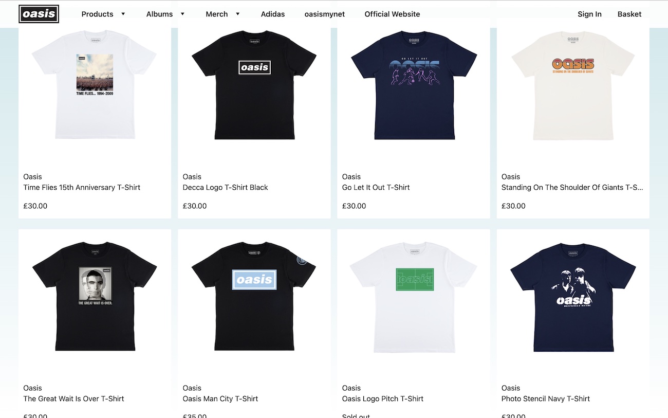 オアシスのオリジナルTシャツの一部ラインアップ。オアシスの公式オンラインストアから
