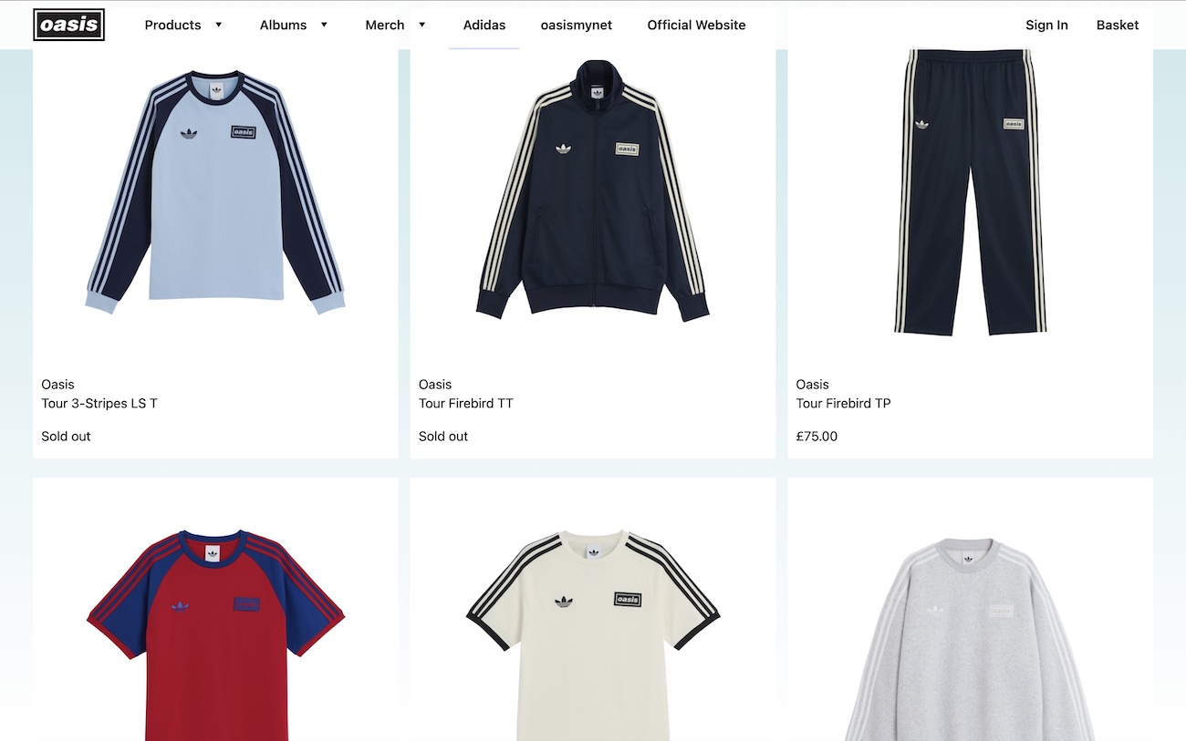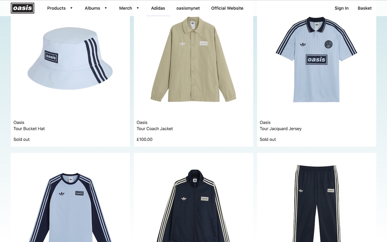 オアシスと「アディダス」のコラボコレクションの一部ラインアップ。オアシスの公式オンラインストアから