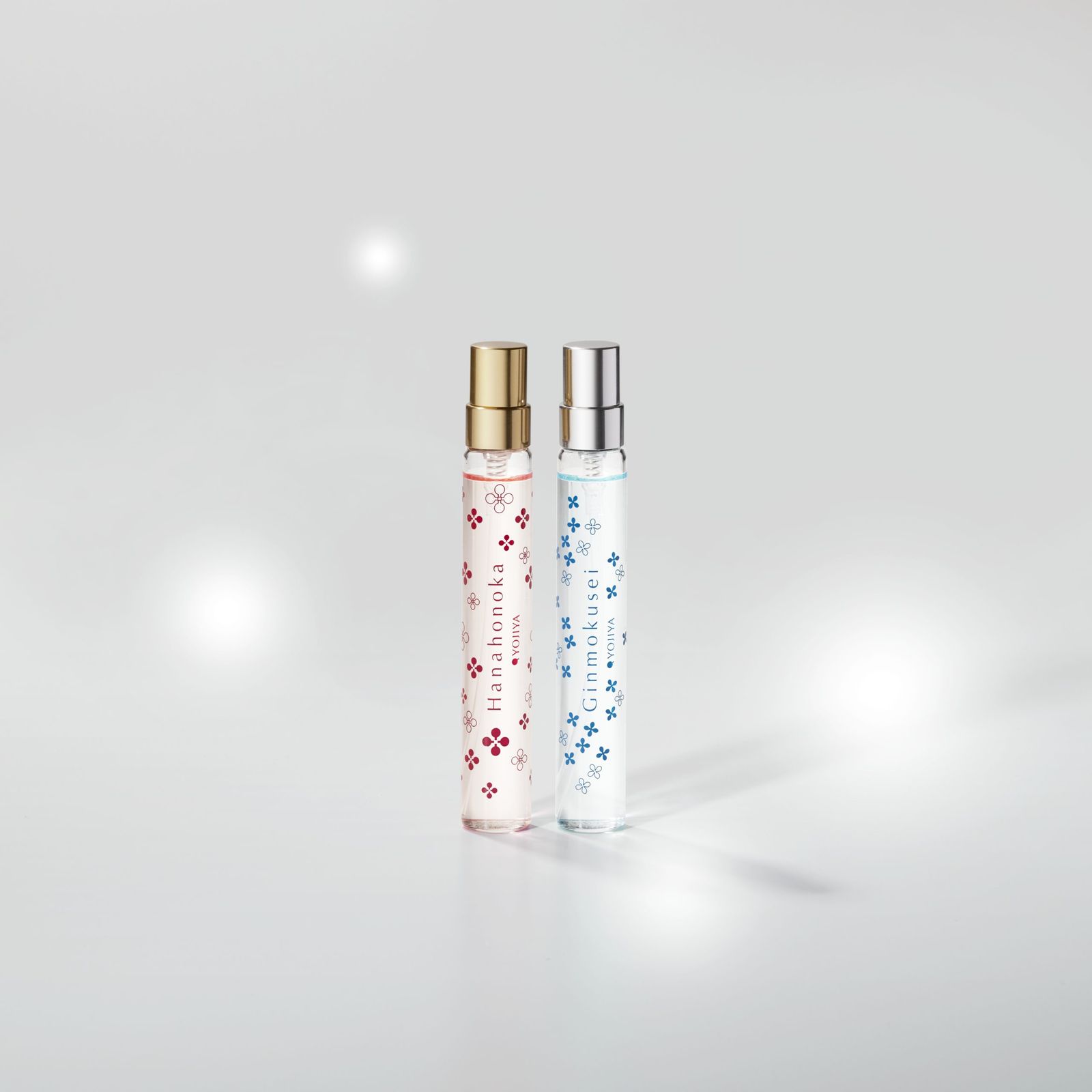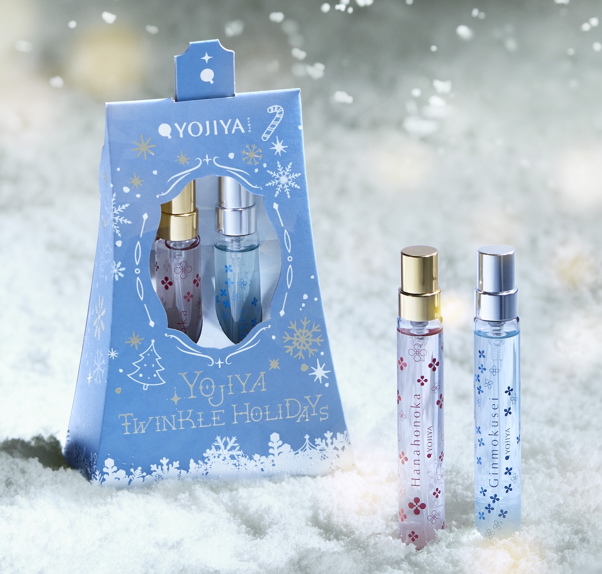 “トワレでトゥインクルセット”は「よーじや」で人気の香りシリーズから、上品で華やかなフルーティフローラル調の“ハナホノカ オードトワレ”(9mL)とほの甘く幻想的な銀木犀の香りが楽しめる“ギンモクセイ オードトワレ” (9mL)の限定デザインをセットにした。それぞれ単独で使用するほか、2つの香りを重ねたクリスマスブレンドとしても楽しめる。