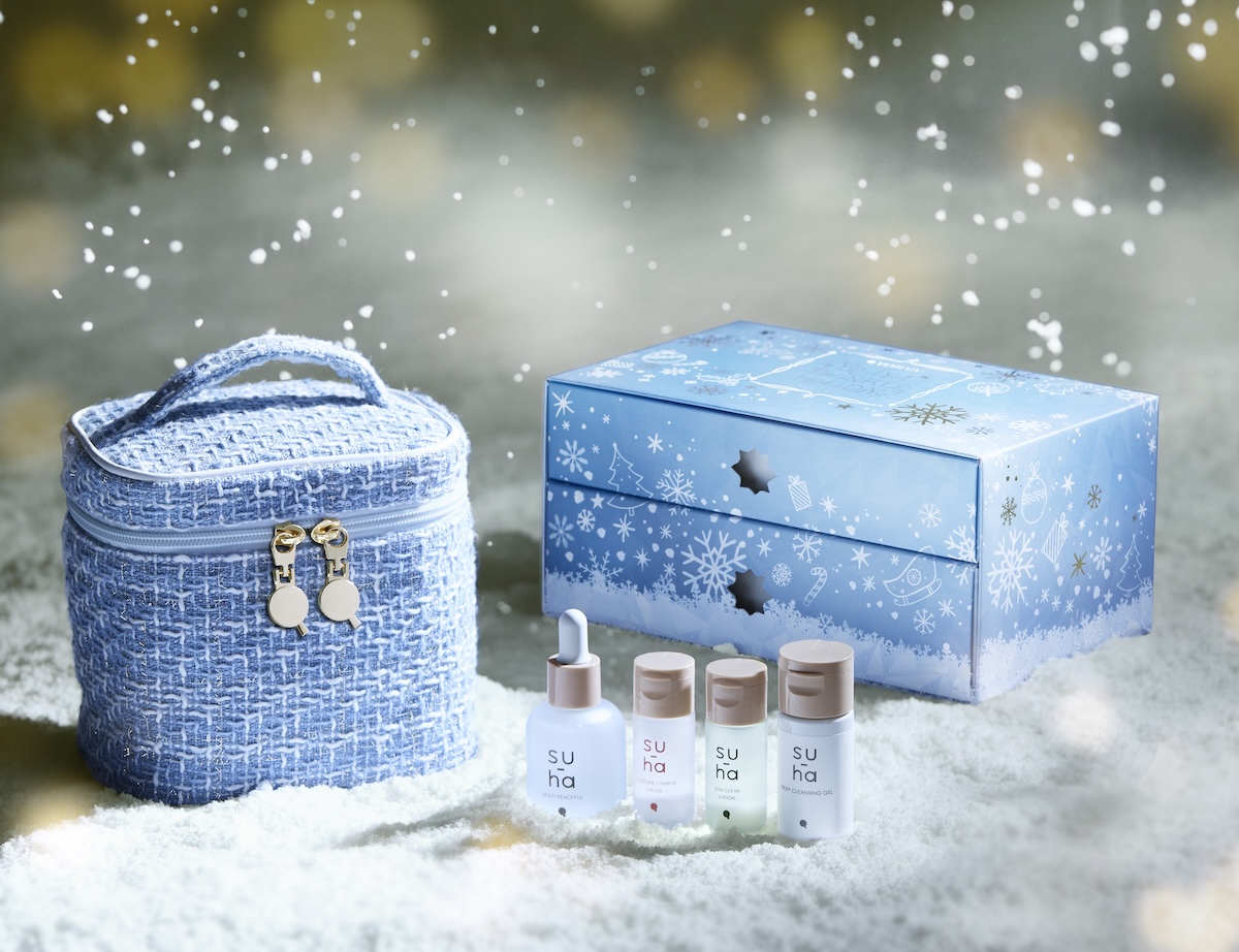 “すーはでトゥインクルセット”は、ゆらぎ肌にもデリケートに接するフェイシャルケアブランド「すーは」のアイテムを中心に構成し、メイク落とし“スーハ ディープクレンジングジェル ミニサイズ”、“スーハ ウルオイチャージローション ミニサイズ”、“スーハ カクシツクリアローション ミニサイズ”の化粧水2種、美容液“スーハ マルチピースフル”の現品と、限定バニティポーチをセットにした。チェスト型のボックスは雪の結晶、手袋、輝くツリーなどクリスマスの雪景色をモチーフにしたパッケージデザインを採用。スキンケアアイテムを収納できるバニティポーチは雪景色のような色合いのツイード生地で、持ち運びに便利なサイズに仕上げた。なお、同製品の予約者には予約特典として“スムースアップホイップ ミニサイズ”を進呈するほか、公式オンラインショップで購入すると“モアモイストミルク”と“バランシングミルク”のパウチサンプルをプレゼントする。