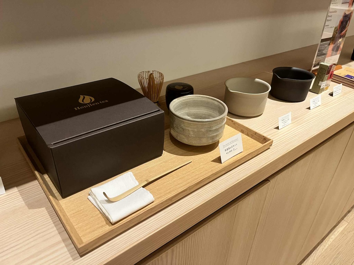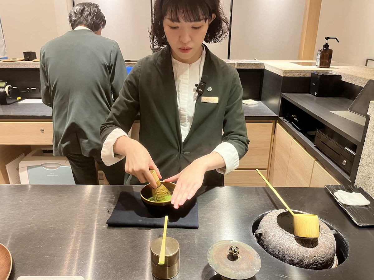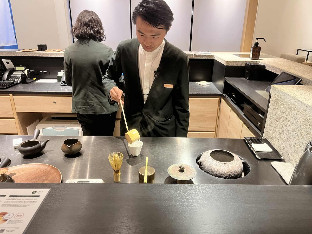 2度目のバスタイムを満喫した後は、いつもより早めに就寝。眠りはいつも以上に深かったと思う。翌日は日の出と同時にすっきり目覚め、7時半には2階のティーカウンターへ。お茶と眠りのご自愛ステイのプランでは、茶バリエによるお抹茶体験「ご褒美の一服」を予約不要で参加できるのだ。これは初心者でも学べる約30分のレクチャー。心を整え、茶せんを手にしてお抹茶を点ててみる。お湯を入れるタイミング、茶せんの持ち方や点てるコツなどを一通り教えてもらうのだが、お手本と比べるとそのできは一目瞭然(笑)。それでも自分で点てたという達成感があり、自宅でもお抹茶タイムを取り入れてみようかな、なんて思う。実際、ショップで販売しているお点前セットを購入し、自宅で実践するゲストも多いのだそう。
