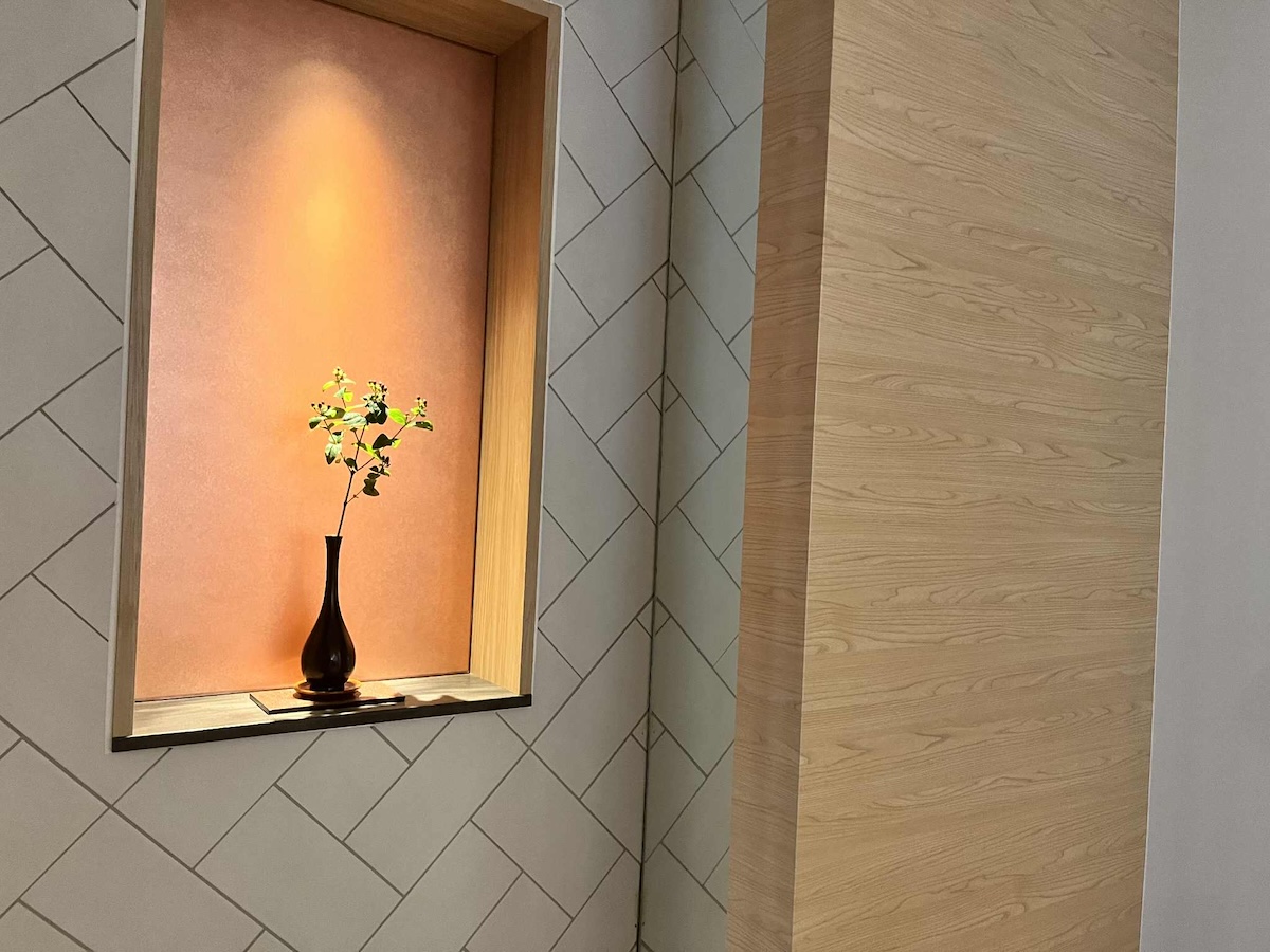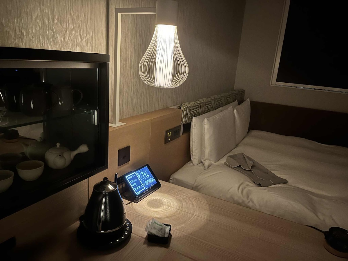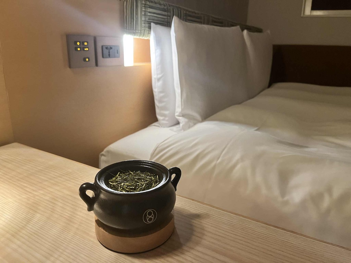 部屋の中でもお茶を五感で味わうための工夫が満載!まずはベッドサイドのライトが茶せん型という遊び心も楽しい。部屋そのものはコンパクトだが、空間を賢く生かしているので、洗面の横に茶器がまとめて収納されて、カウンターの延長がデスクとなって作業しやすく、室内でこもるのもなかなか快適だ。このプランでは部屋でお茶の香りで癒されるよう、茶香炉も部屋に一台用意されている。茎茶の香りがふわっと香ばしく、呼吸が整うよう。香りによるセルフケアにより、睡眠導入にも速やかに。お茶のパワーを感じる。