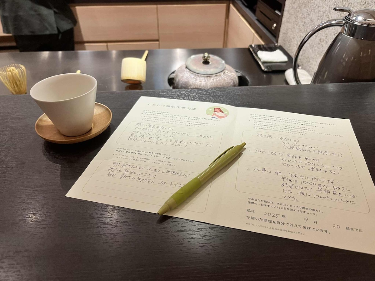 チェックイン後はフロントデスクに隣接したティーカウンターで「わたしの睡眠作戦会議」なるジャーナリングに挑戦。ティーカウンターはフロントデスクと一体化しており、チェックインを担当してくれたスタッフがそのまま日本茶のプロ「茶バリエ」としてお茶を淹れてくれる。なんと滞在中、宿泊者は気軽に立ち寄れ、きんと冷えた煎茶や丁寧に点てた抹茶、季節のお茶など、何種でもいただけるのだとか(しかも無料! 朝は8~10時は抹茶のみ、午後3~10時オープン)。