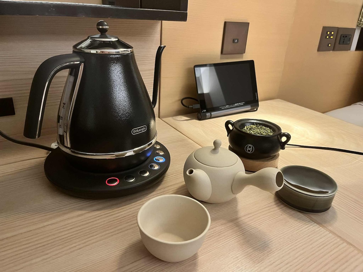 お茶は江戸番茶や狭山火入れなどの4種。茶器も厳選した急須など上質なもの。これがうれしい。せっかくのお茶も器があじけないと残念だもの。寝る前にはこのお茶を、目覚めはこれがすっきりしそう、とあれこれ考えるのも楽しい。しかも50度~60、80、95、100度まで細やかな温度設定ができるデロンギの高性能なポットが備えられ、本格的なお茶時間を滞在中はいつでも楽しめる。