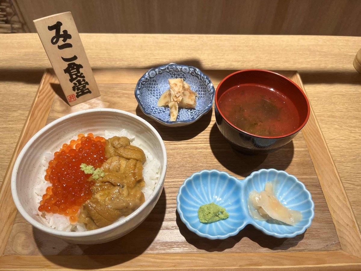 すべては睡眠のため! 胃腸に負担をかけたくないので、今宵は休肝日。人気寿司屋による立ち食い海鮮丼のお店「みこ食堂」で雲丹いくら丼(1900円)をオーダー。出汁のきいたお椀、みこ汁が飲み放題など、うれしいサービスも。すこしでも長く部屋でゆったりくつろぎたかったので、さくっと立ち食い飯で正解だった。