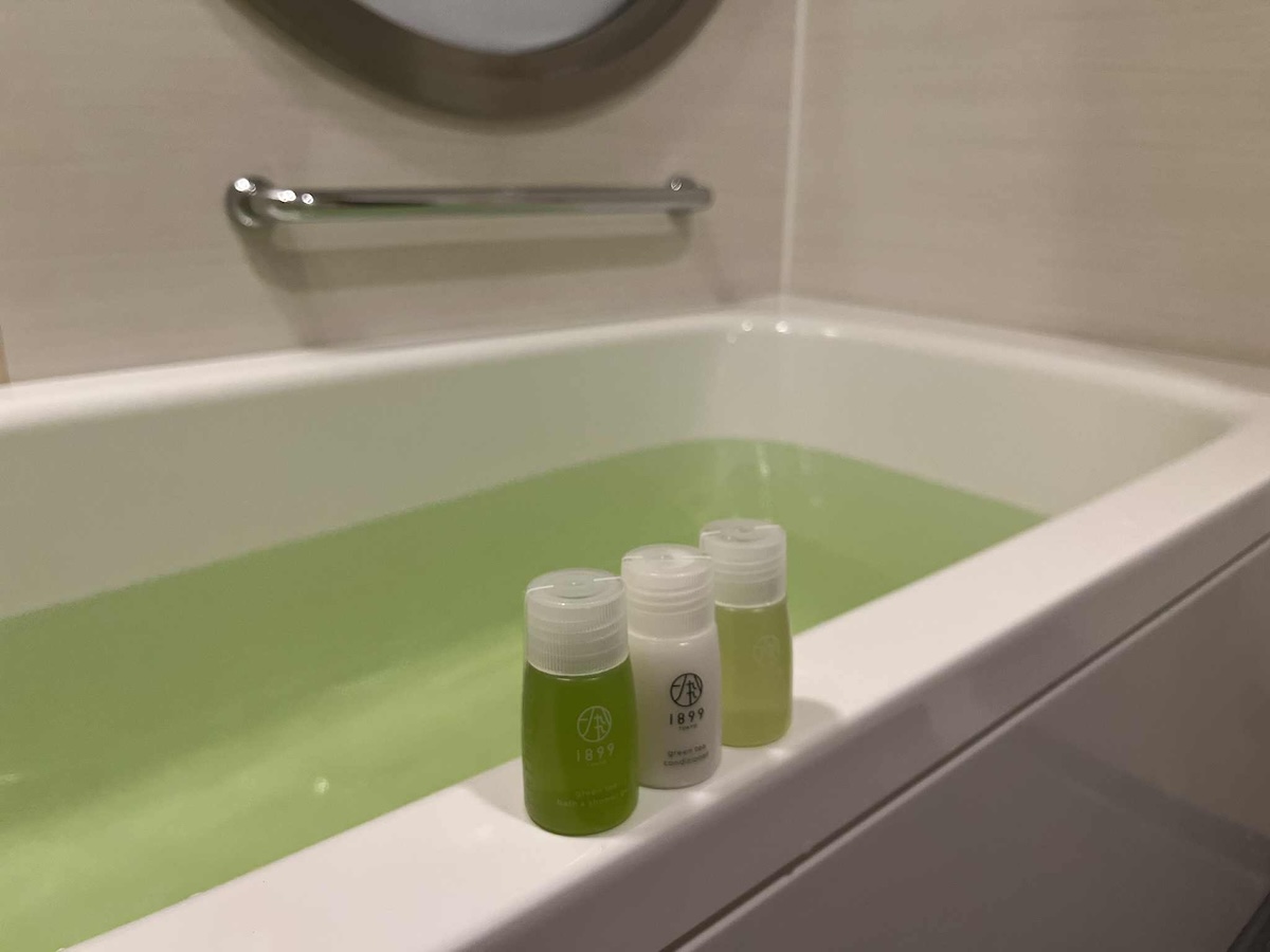 バスタイムもお茶がテーマ。緑と香りがさわやかなお茶の入浴剤で、心とからだをほぐす。緑茶成分入りのシャワージェルやボディーローションもふわっと甘い香りが立ち、気持ちも和らぐ。ちなみに睡眠の90分ほど前に入浴すると、一時的に上昇した深部体温(皮膚温ではなく体の内部の温度)がゆるやかに下がり、自然な眠気が訪れるそう。就寝1時間半前にも入浴してみることにした。