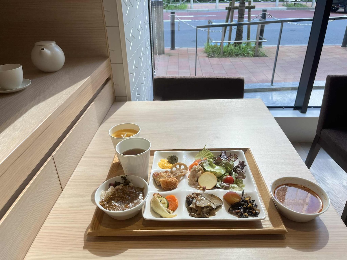 朝ごはんは食材としてのお茶をとりいれたヘルシーメニュー。ビュッフェスタイルで茶めしや緑茶のパンをもあり、和食でも洋食でも好きな盛り付けが楽しめる。新鮮野菜には緑が鮮やかなお茶ドレッシングを。グリルチキンに碾茶塩を振るなど定番メニューにすこしひねりを効かせた品ぞろえ。お茶はレモングラス風味の「和み」、ゆずが爽やかな「清らか」、しょうがの効果を感じる「ぽかぽか」など8種類以上のオリジナルブレンドから選べる。