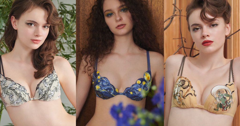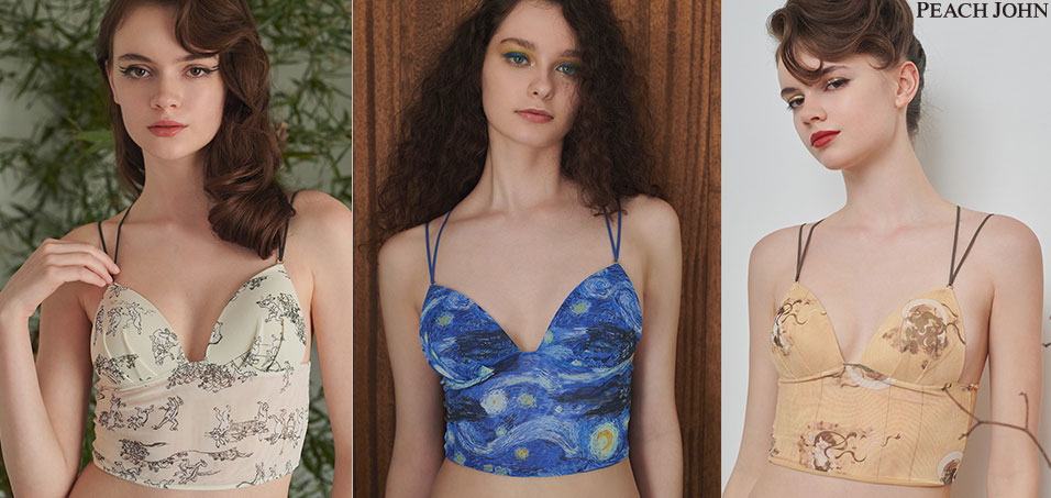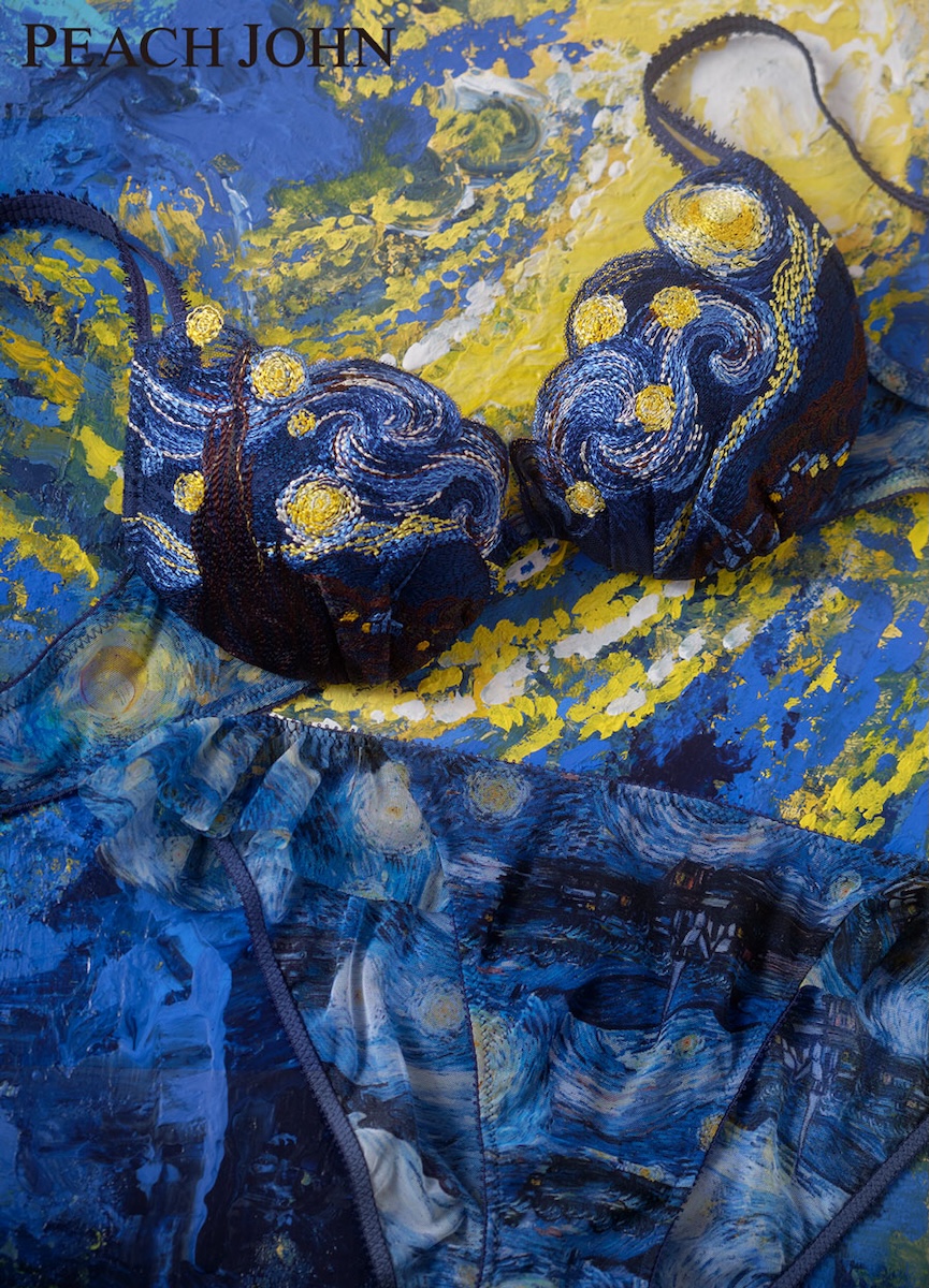 “巨匠のブラ”シリーズは、世界中の偉大な芸術家の傑作を緻密に再現した「ピーチ・ジョン」の人気デザインブラシリーズ。手の込んだ刺しゅうレースやプリント、立体的なモチーフの縫い付けなど、さまざまな手法を駆使し、名画からそのまま出てきたようなデザインが特徴だ。