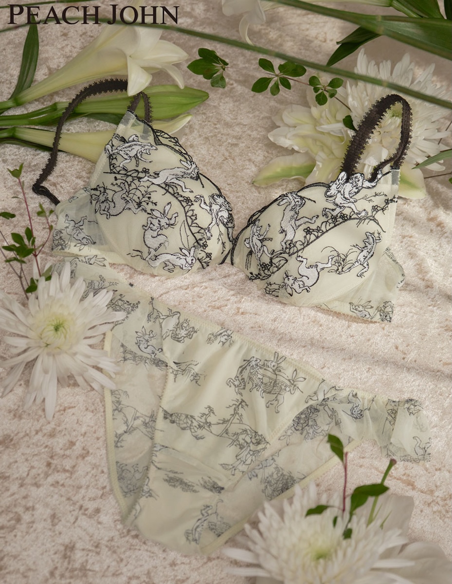 それぞれB~Fカップ、アンダーは65、70、75に対応し、そろいのショーツ(S、M、L、各2100円)とTバック(S/M、M/L、各2100円)も用意した。ショーツは前後ともに絵画をプリントしたパワーネットを使用し両サイドには端が切りっぱなしのフリルを、Tバックはプリントパワーネットや刺しゅうレースをふんだんにあしらっている。
