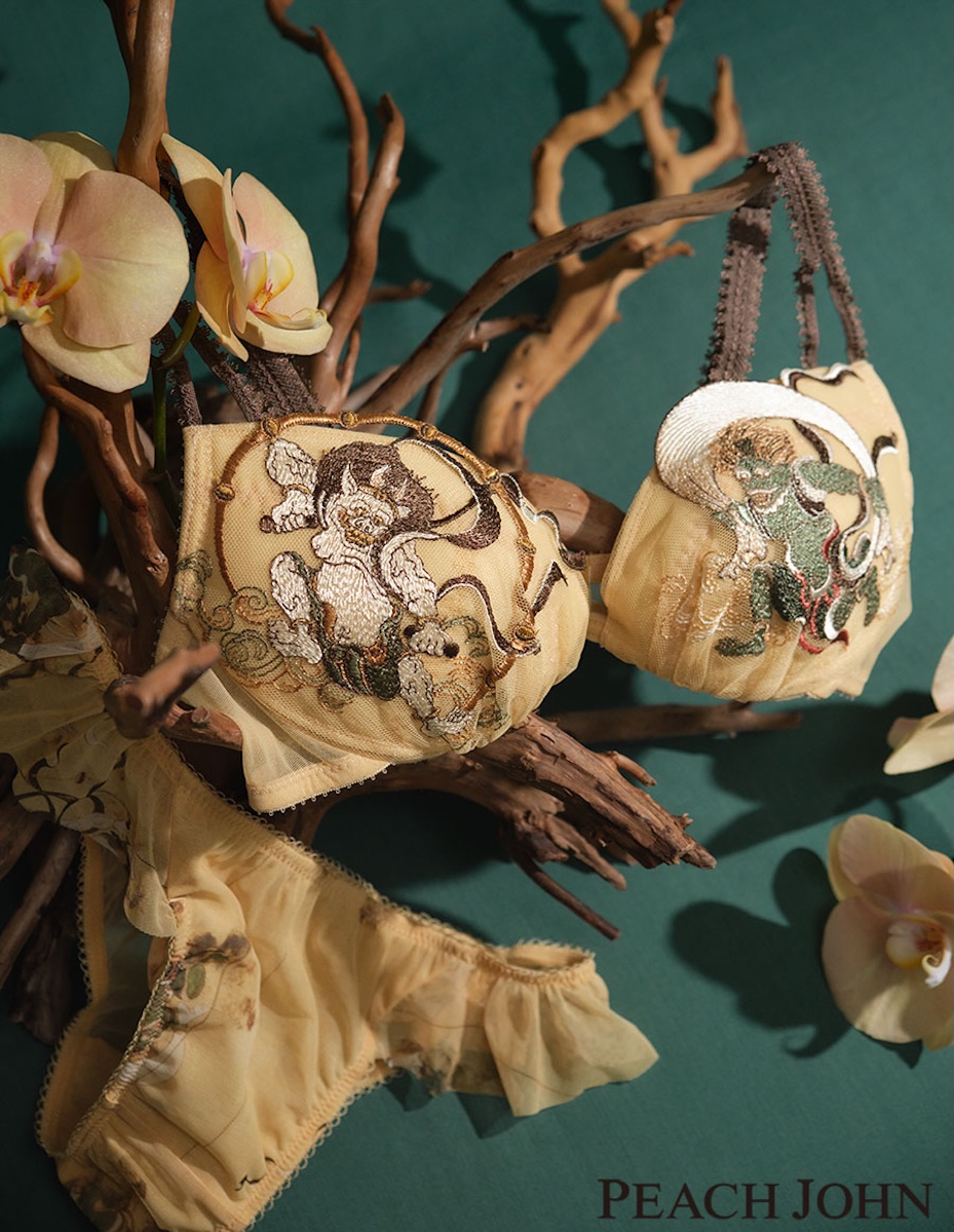 新作の“ゴッホスターリー”は、後期印象派の巨匠ゴッホの代表作「星月夜」をモチーフに、うねるような独特の筆使いを刺しゅうで表現した。右カップは糸杉の樹、左カップには街並みと、アシンメトリーなデザインに仕上げている。“鳥獣戯画キナリ”は京都・高山寺に伝わる国宝で、平安時代後期から鎌倉時代にかけて描かれた絵巻物「鳥獣人物戯画」がモチーフ。ウサギやカエル、サルなどの擬人化された動物の可愛らしくコミカルな姿を刺しゅうレースで表現した。復活カラーの「風神雷神ゴールド」は、江戸時代初期に活躍した俵屋宗達の国宝「風神雷神図屏風」をデザイン化。金屏風をイメージしたゴールドカラーのチュール地に、風神と雷神を刺しゅうしたレースでカバーし、ネックラインにはモチーフが飛び出す大胆なデザインを採用している。