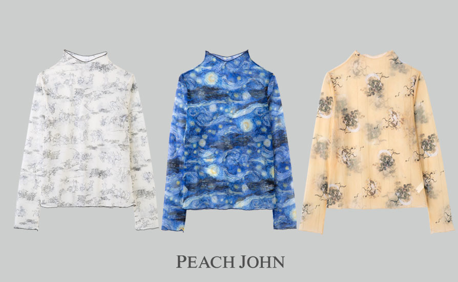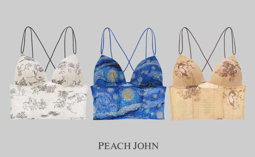 「ピーチ・ジョン(PEACH JOHN)」は、世界的な名画からインスパイアされた“巨匠のブラ”シリーズの最新作を発売した。今回はフィンセント・ファン・ゴッホ(Vincent van Gogh)の代表作「星月夜」と、日本美術の国宝「鳥獣人物戯画」をモチーフにしたランジェリー2型をラインアップ(各4500円)。好評だった「風神雷神ゴールド」やシリーズ初のノンワイヤーブラ(3800円)、シアートップスなども販売している。
