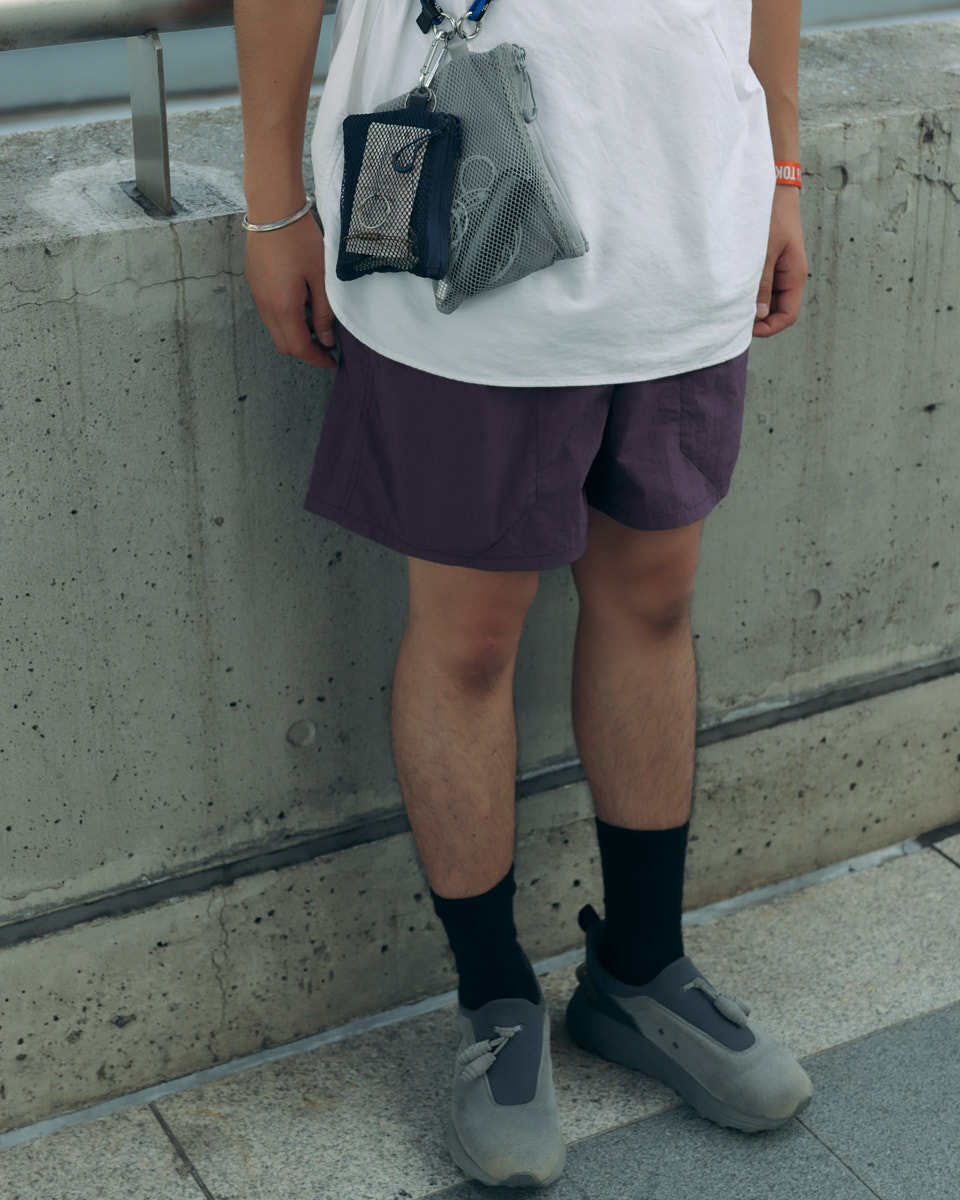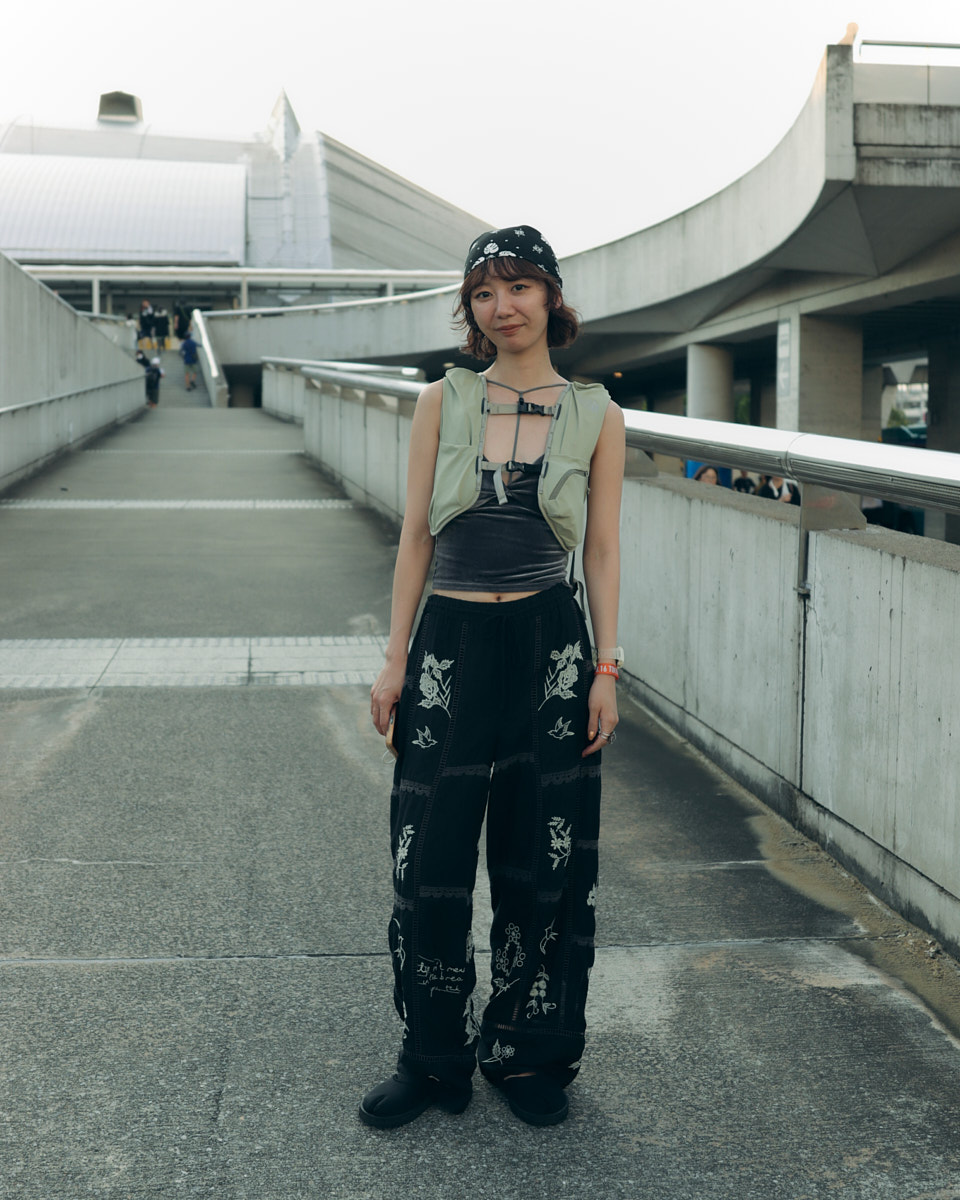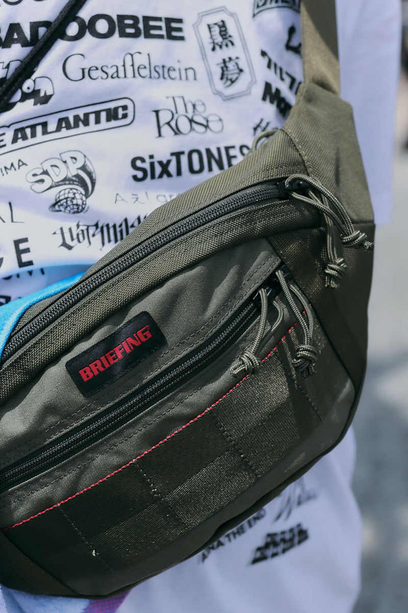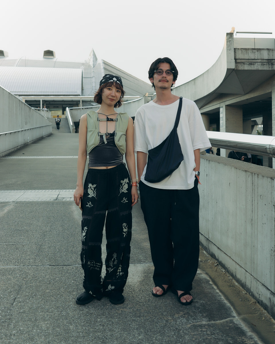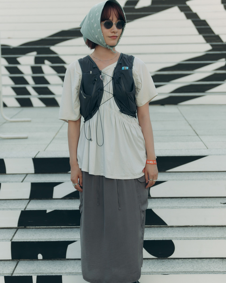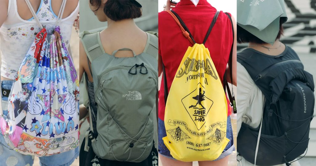 会場で目を引いたアイテムは、“フェスバッグ”の新顔としてじわじわ人気を集めているナップサックやランニングバッグだ。軽やかなスタイリングに合わせやすく、都市型フェスならではのコンパクトな荷物にちょうどいいサイズ感とあって、多くの若者が背負っていた。