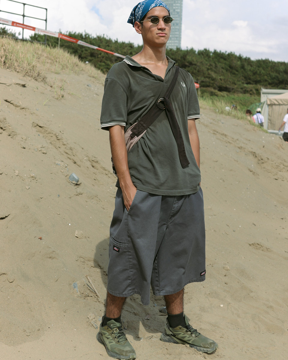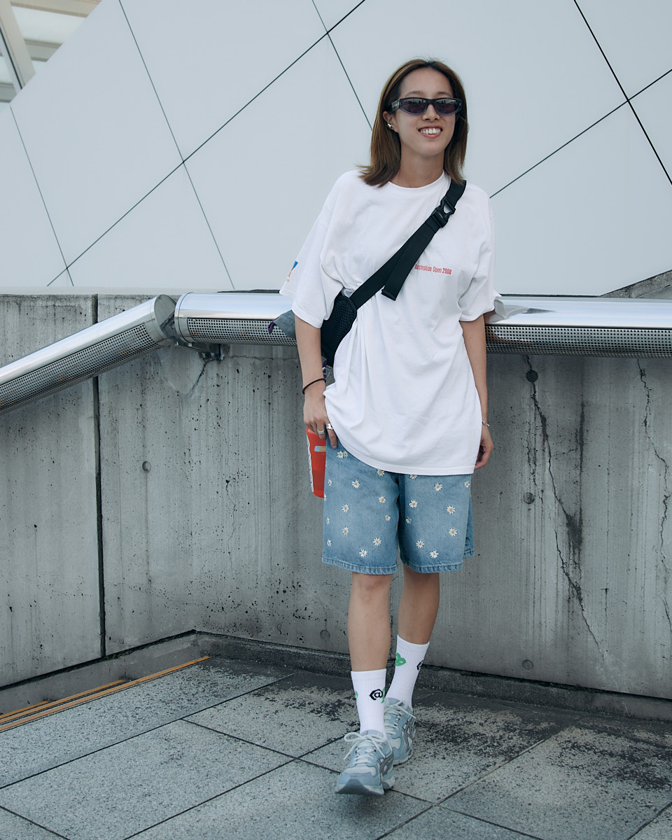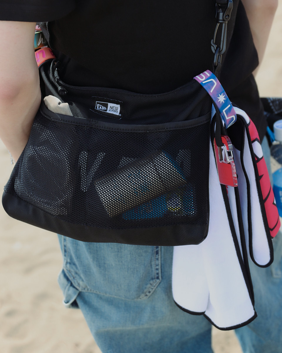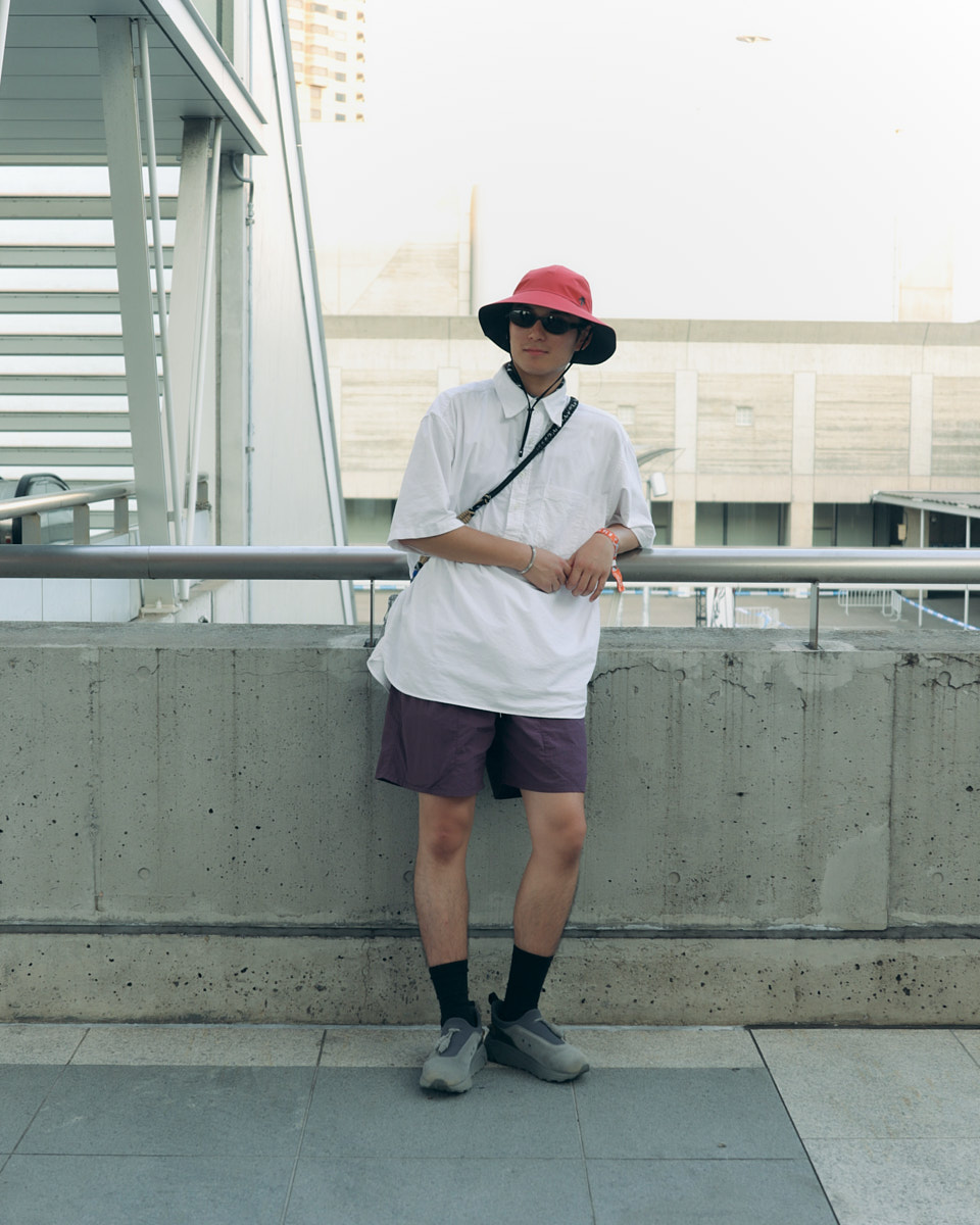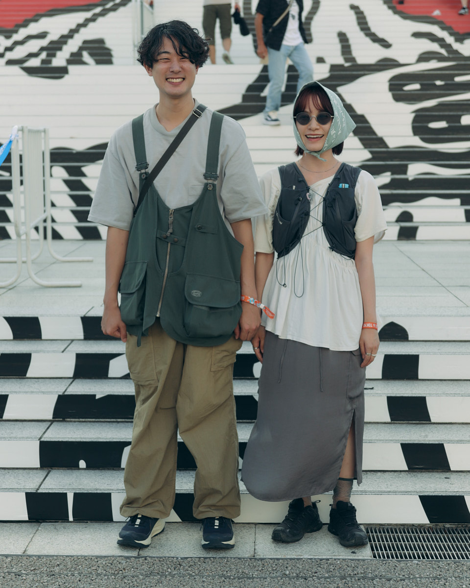 会場で目を引いたアイテムは、“フェスバッグ”の新顔としてじわじわ人気を集めているナップサックやランニングバッグだ。軽やかなスタイリングに合わせやすく、都市型フェスならではのコンパクトな荷物にちょうどいいサイズ感とあって、多くの若者が背負っていた。