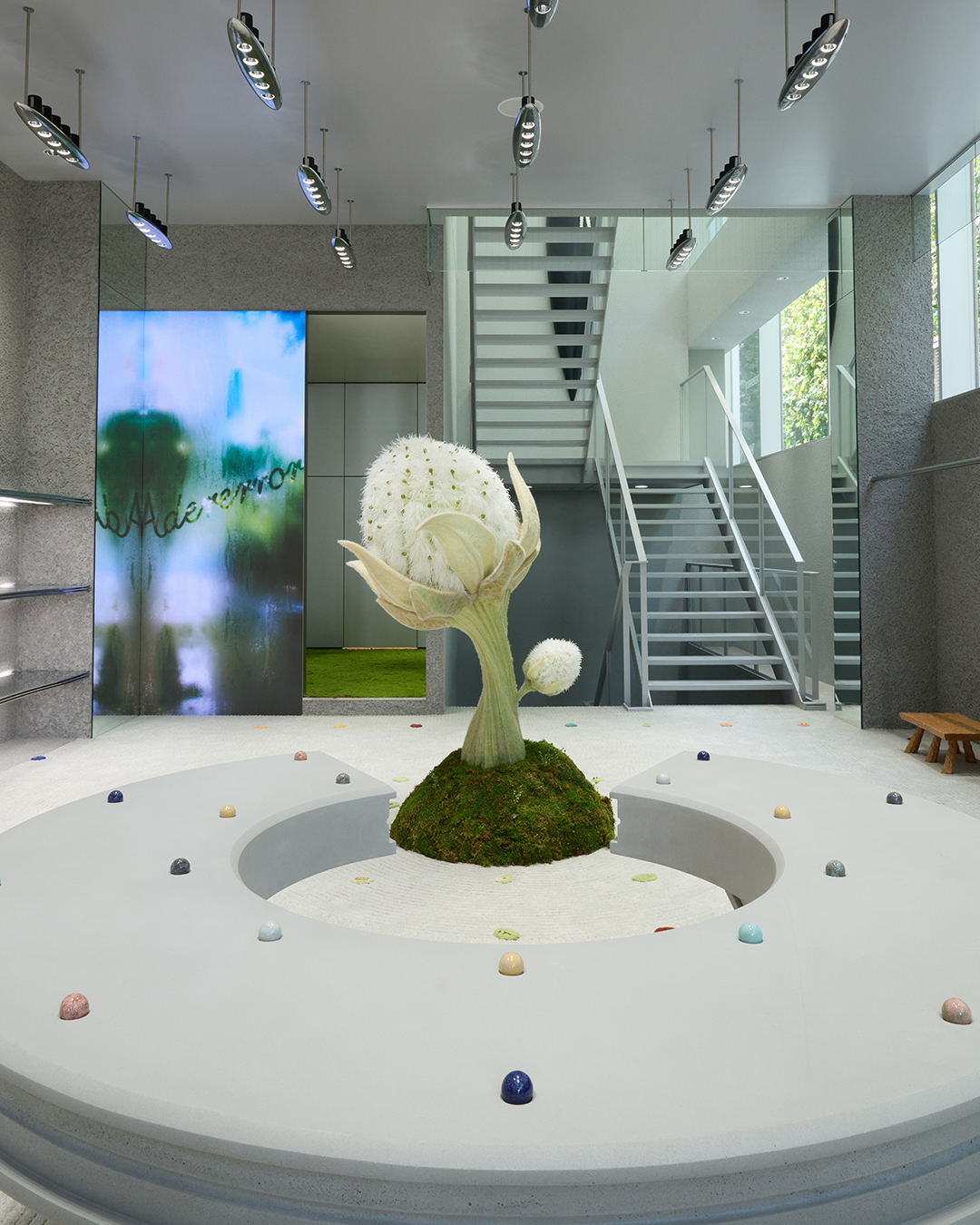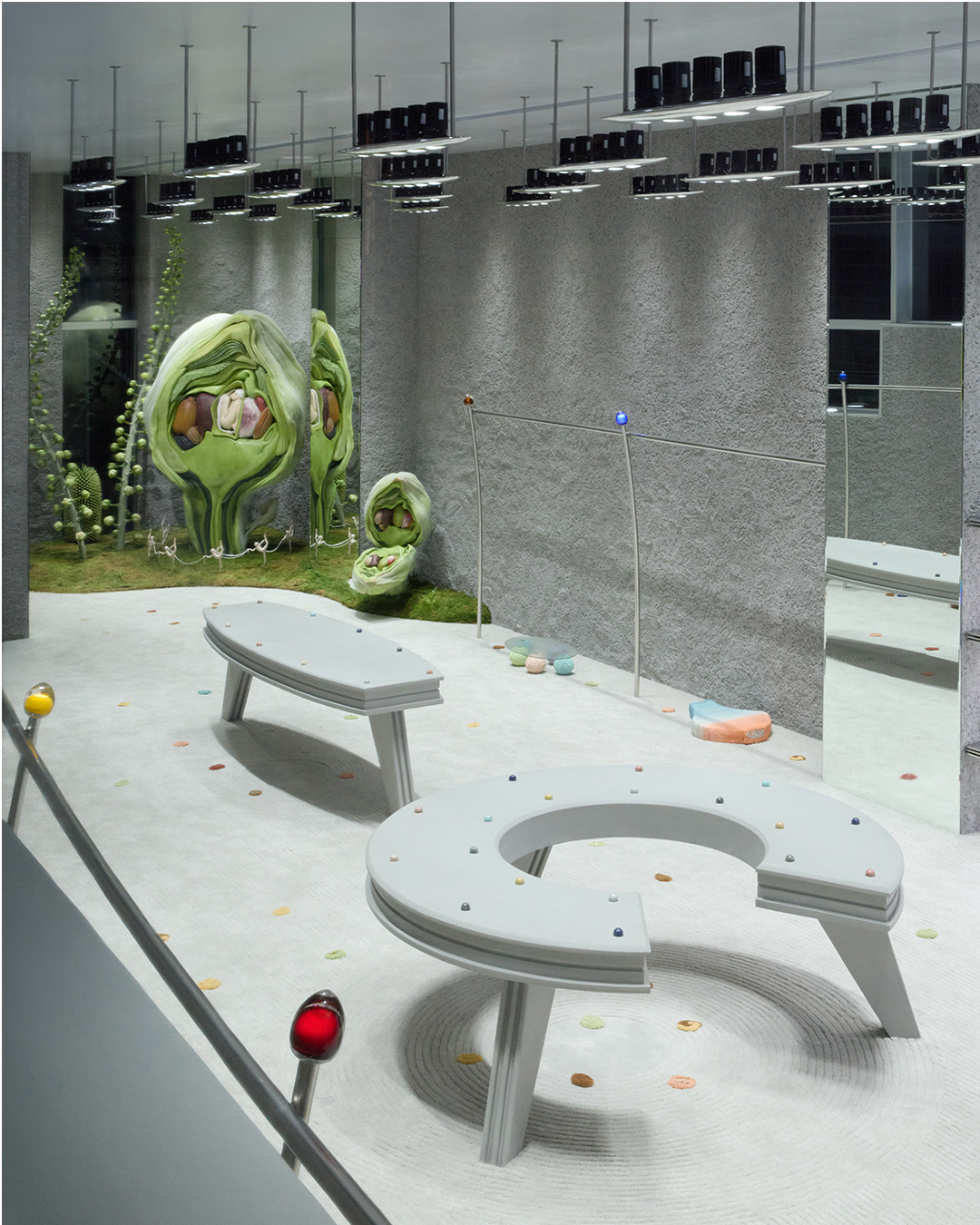 同店は“コンティニュアム(CONTINUUM)”というコンセプトのもと、小さな生命体や植物たちが有機的に絡み合い共存しながら、無限に拡張していく多次元的な生態系の循環エコシステムを空間デザインで表現した。