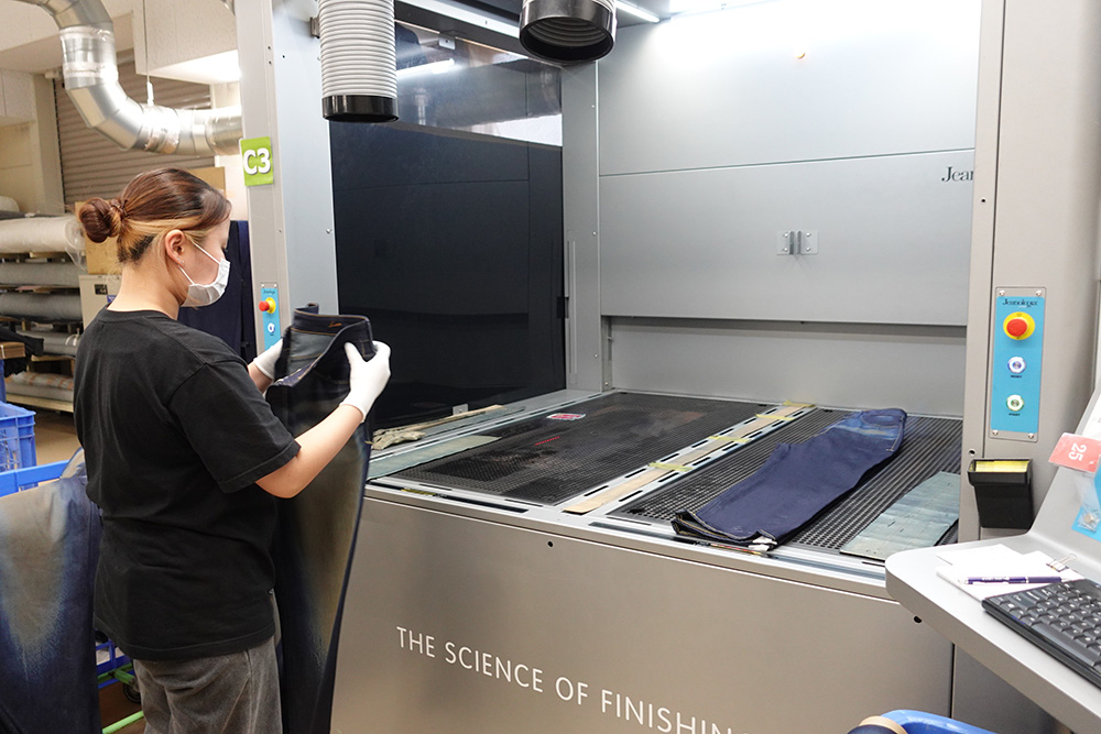 総社カイタックファクトリー概要:カイタックグループのジーンズ製造子会社として2019年3月に分社化。裁断から縫製、洗い加工、検品仕上げまでジーンズを一貫生産。最新鋭のレーザー加工従業員数は120人。女性が87%を占め、平均年齢は42歳。厚労省のユースエール認定企業。自動裁断機、オゾン脱色機やナノバブル加工機、スマートミシンなどの最新の機器も備える。月2万本を生産