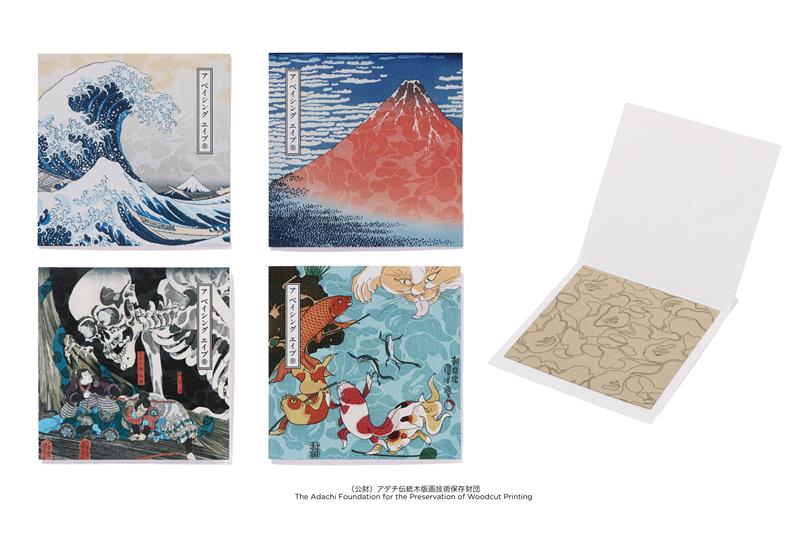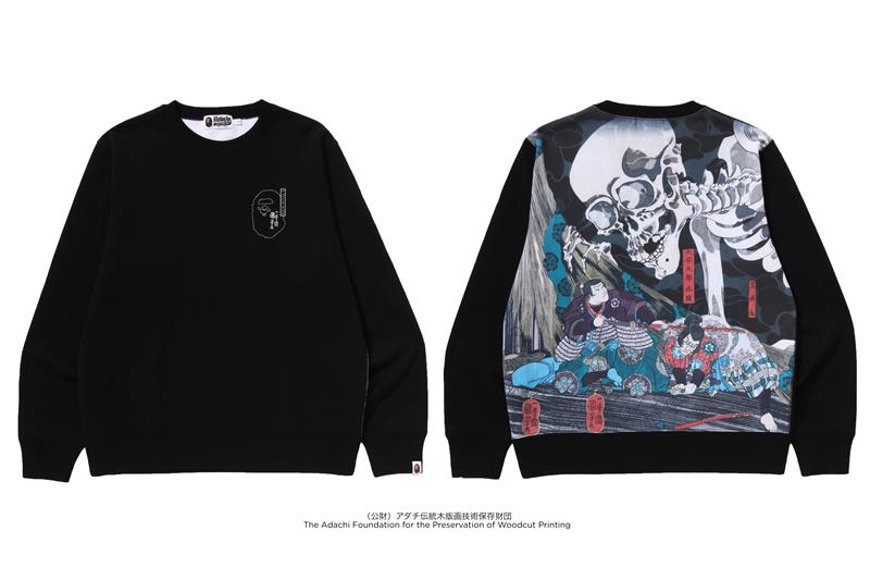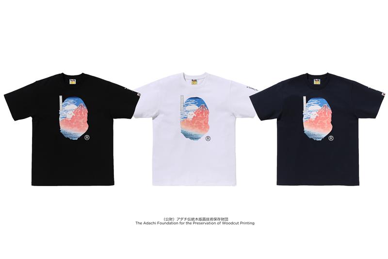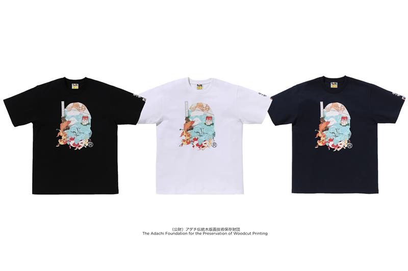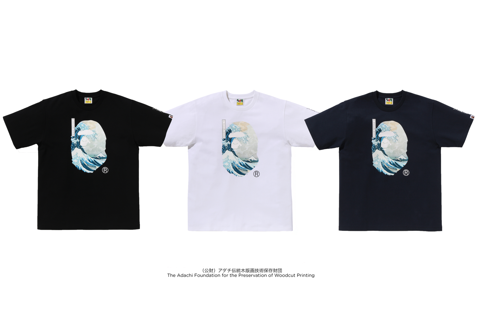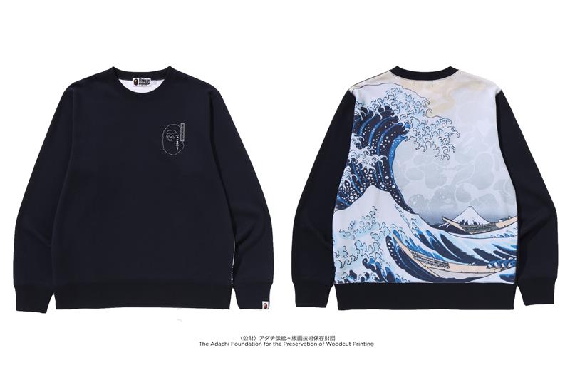 2025年秋冬シーズンのテーマ“Connect with the People”は、時代や文化を超えて人々の心をつなぐ“アートの力”にフォーカスする。本コラボレーションでは、世界的に名高い2人の浮世絵師、葛飾北斎と歌川国芳の代表作から、北斎の“冨嶽三十六景”シリーズより“神奈川沖浪裏”と“凱風快晴(通称・赤富士)”、そして国芳の“相馬の古内裏”と“金魚づくし 百ものがたり”をセレクト。公益財団法人アダチ伝統木版画技術保存財団の監修のもと、これらの浮世絵にBAPE® カモパターンを重ねて再構築した。