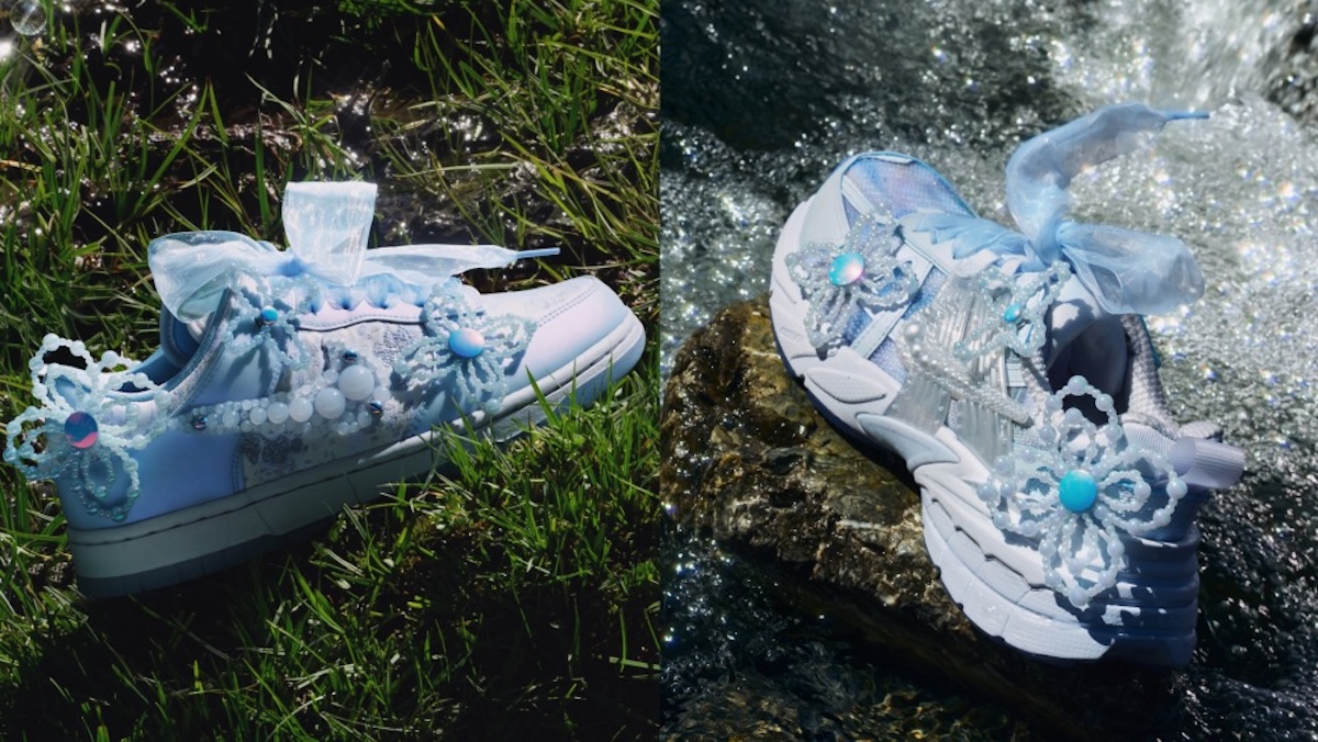 同コレクションは、太陽の光に当たる水や泡など自然に着想を得たアイテムをラインアップし、スニーカーのほか、スポーツブラ、Tシャツ、靴下、バッグなどをそろえる。“ダンク”スニーカーは、アッパーにシャガード素材を使用し、フローラルの刺しゅうをあしらった。“V2K”スニーカーには、シルクスクリーンで波のパターンを施した。