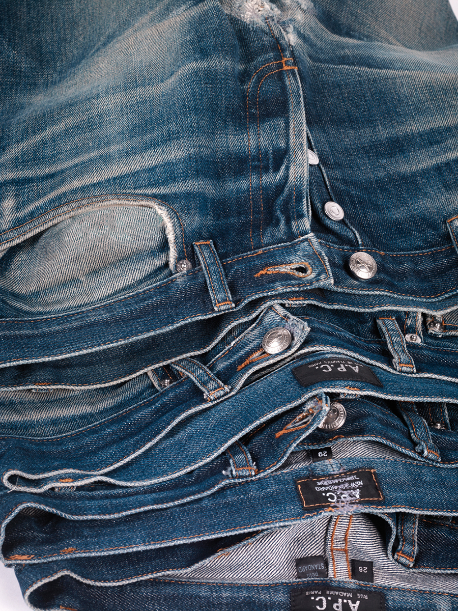 デニムの引き取りサービスは、店舗でリジットデニムを購入し、実際に着用した人が対象だ。店舗で色落ちの審査をし、良い色落ちのものは「アー・ペー・セー」が引き取り、代わりに新品のデニムを半額で提供する。引き取ったデニムは洗浄しリペアを施し再販売する。SDGsとしても製品寿命を延長させ、時代に即したプログラムとなっている。