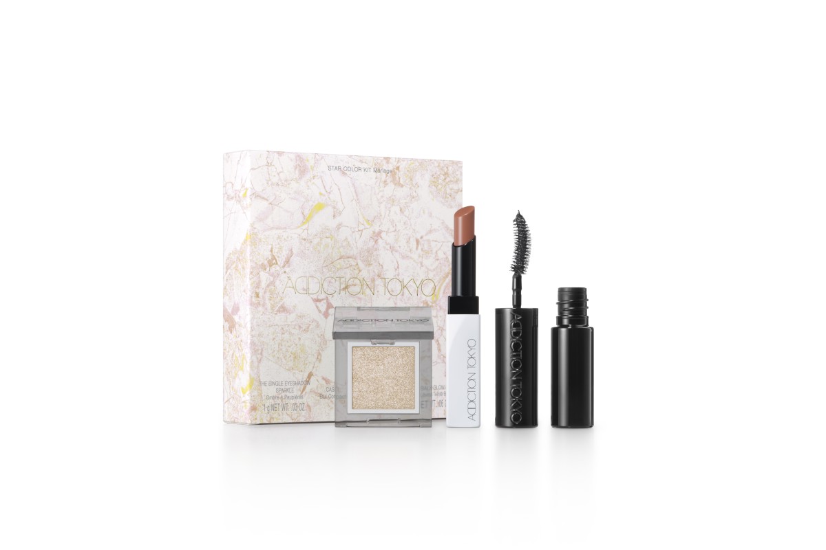 “スター カラー キット マリアージュ”は、濡れたように輝くシャンパンベージュのスパークルカラー“ザ シングル アイシャドウ 002SP マリアージュ”に、艶を与えながら唇をコーラルベージュに彩るティントリップバーム“ザ リップバーム グロウティント 002 ハートシェイカー”と、ミニサイズの“ザ マスカラ インテンス ラッシュ 004 ウルトラ ブラック”がセット。どちらもスタイリッシュなスモークカラーのアイシャドウケースに収めた、光と彩りのレイヤーを楽しめる。