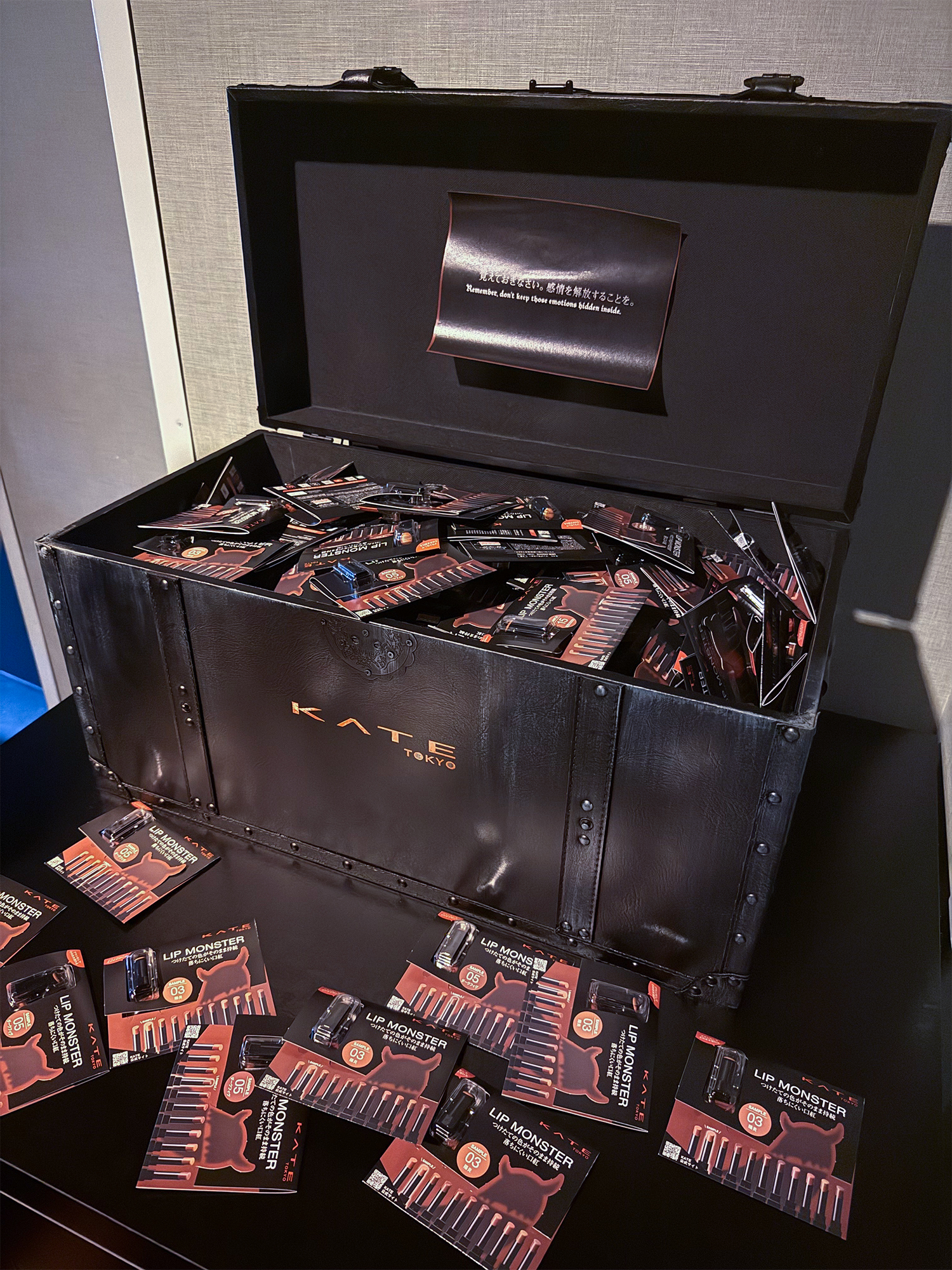 さらに、タッチアップスペースも完備。診断結果“感情の秘薬”を実際に試せるのが「ケイト」らしい仕掛け。体験後には、「ケイト」を代表するリップスティック“リップモンスター”のサンプルももらえる。人差し指サイズでフタなしという少しワイルドな仕様だが、USJで化粧品サンプルが配布されるのは、恐らく今回が初めてだろう。ボックスから好きなカラーが選べる太っ腹ぶりで、人気色の“ダークフィグ”や“陽炎”もあった。