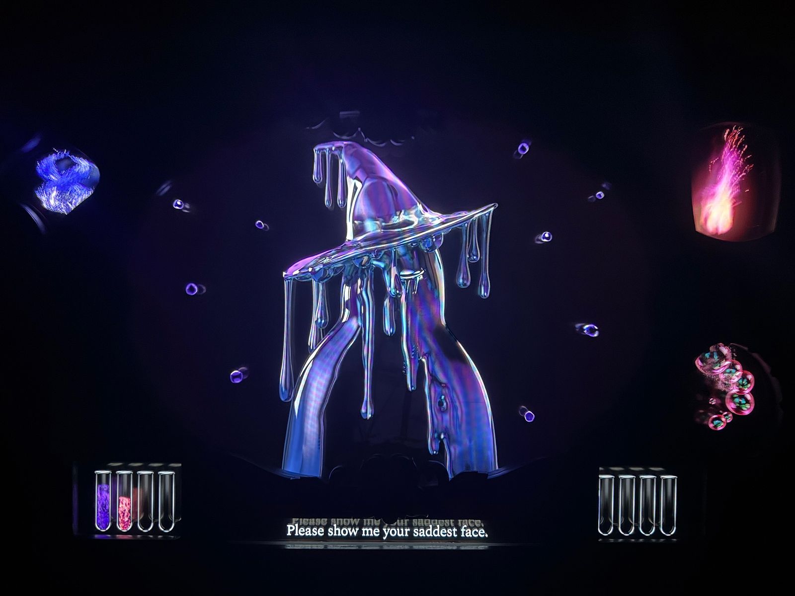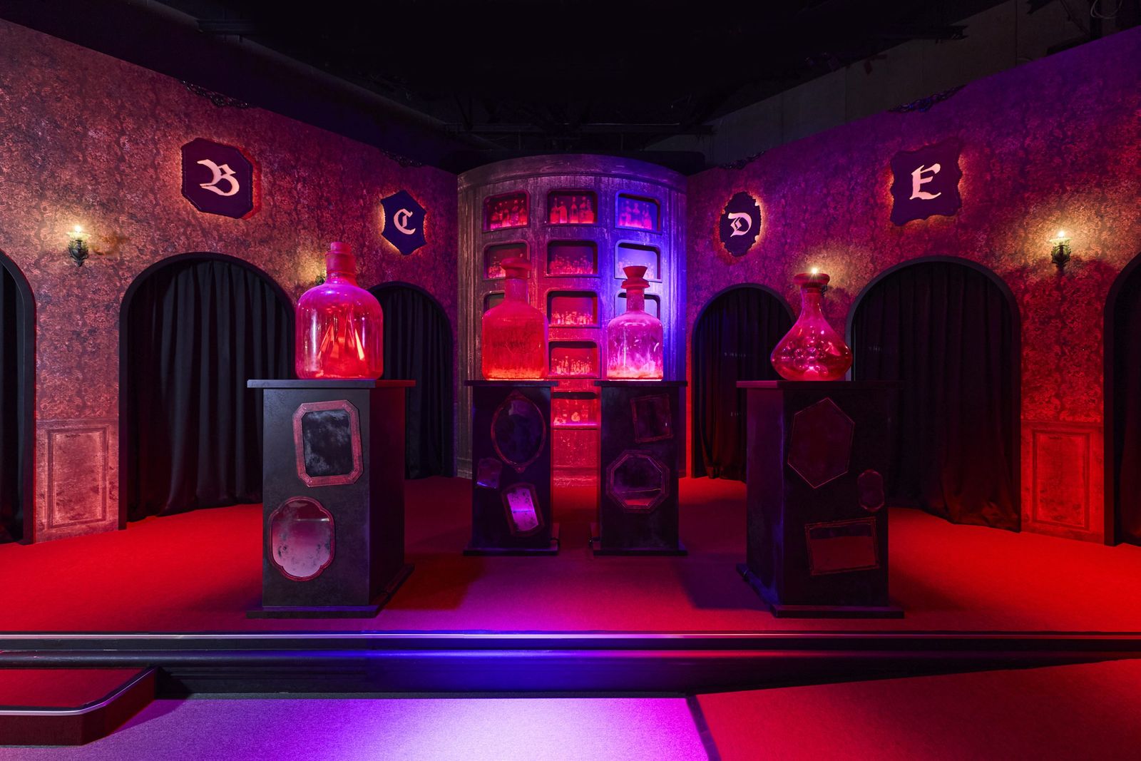 練習を終えると、感情を閉じ込めた大きな瓶が並ぶ真紅の大広間へ。A〜Fの個室に案内され、中には大きな鏡が。いよいよ本番、“感情の診断”が始まる。魔女たちが画面に現れ、鏡に向かって喜怒哀楽の表情を全力で披露する。映像と音響からなる魔女たちの“圧”は予想以上に迫力があり、思わず「すごい…」と声を漏らしてしまったほどだ。