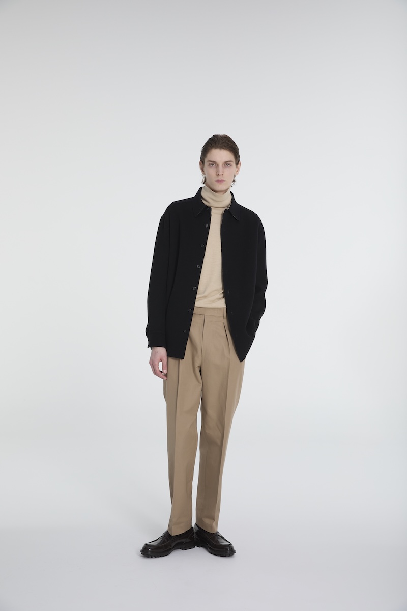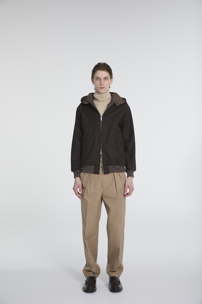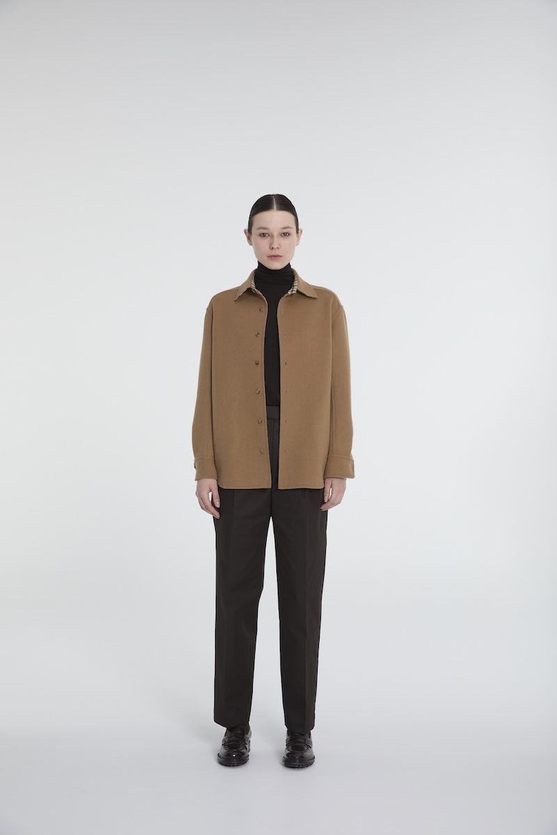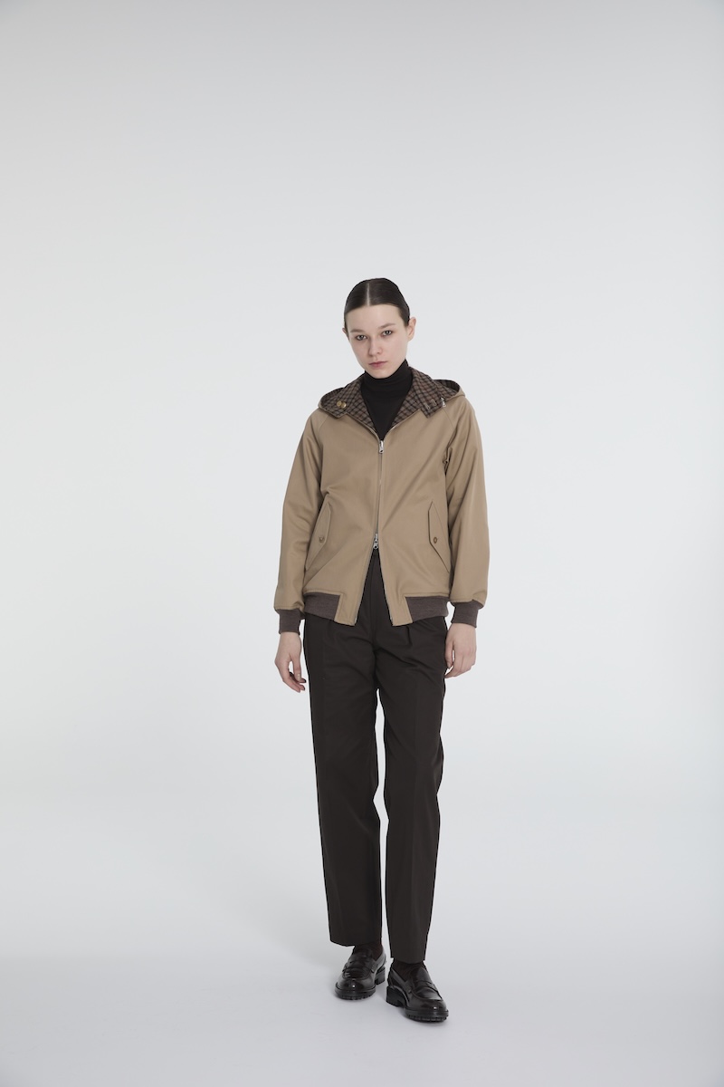 リバーシブル仕様のブルゾン“ハリントンジャケット”の襟ぐりには、オープンファスナーを仕込むことでフードの取り外しができ、表、裏、フードの有無と、1つのアイテムで4通り楽しめる。裏地には、“ハウスチェック”を再解釈した英国製のハウスツイード生地を採用した。リバーシブルオーバーシャツは、ゆったりとしたサイズ感で、工程の70%以上をハンドメードで仕立てた。素材には高級ウールを採用し、ステッチが表に出ない仕立てのため、一枚でも着心地よく、アウターとしても活躍する。セミワイドシルエットのテーパードパンツ“ツープリーツトラウザーズ”には、2本のインタックを施し、光沢としなやかさが特徴のコットンギャバジン素材を用いることで、カジュアルかつリラックスした印象を与える。