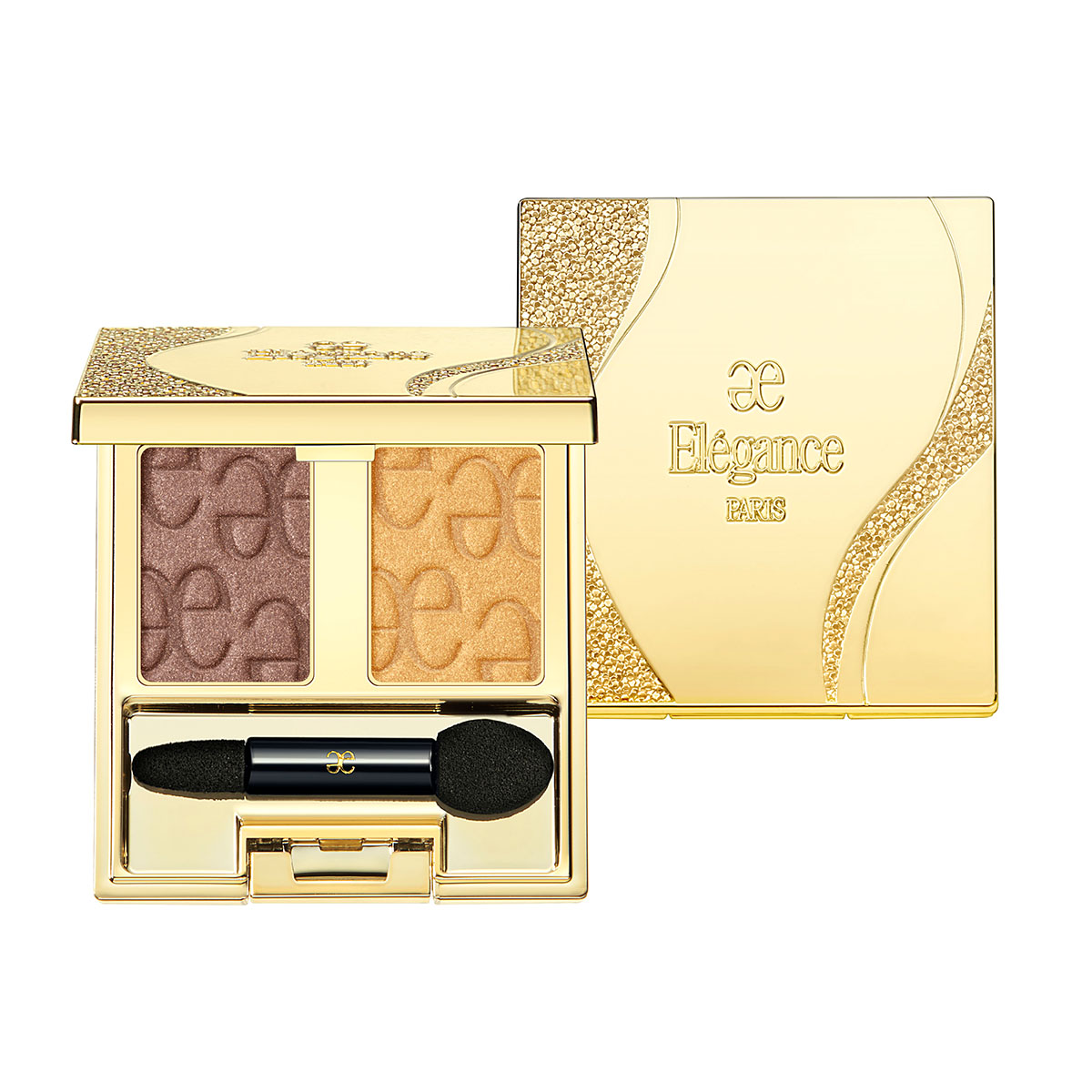 2色アイシャドウパレット“アルモニーアイズ”の限定色“106”は、ひと塗りで絶妙なグラデーションが完成する“カフェオレ”と“アンバーゴールド”をセット。やさしくブレンドすれば、深みの中に上品なきらめきを放つ目元を演出できる。