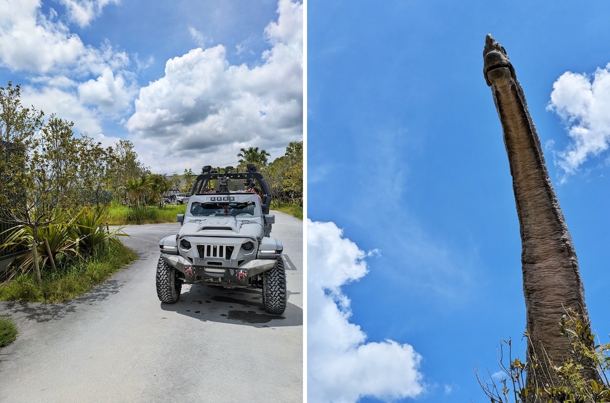 では、パーク入園後に楽しむべきアトラクションとは? まず筆者がおすすめしたいのは特殊車両に乗りこんでジャングルを疾走し恐竜と遭遇する「ダイナソー サファリ」だ。本物の大型車両に乗り込み、起伏にとんだ道を荒々しい運転で突き進むので迫力もスリルも満点!