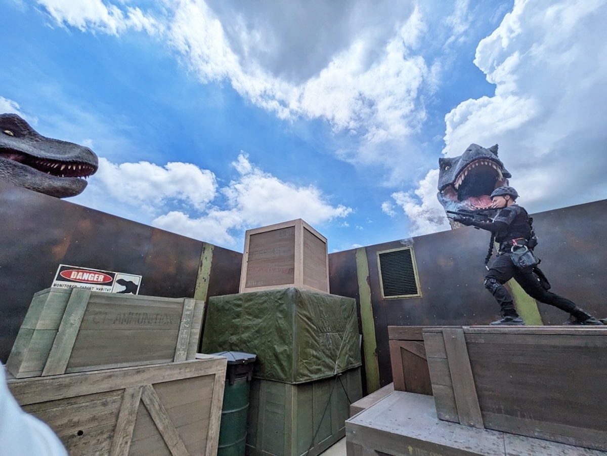 演出やストーリーにもこだわっており、予測不能な展開や立体的な音響効果によって臨場感のある体験に! 筆者は晴天時、雨天時と両方で体験しているが、天候が悪い時や夕方以降の薄暗い時のほうが恐竜との遭遇がリアルでより没入感を味わえる。こちらのアトラクションは夕方以降のほうが空いていることもあり、夜の時間帯もおすすめしたい。