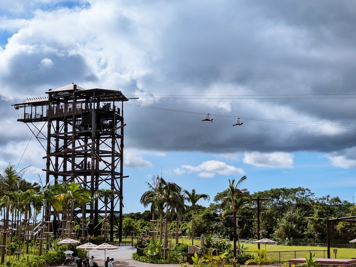 「スカイ フェニックス」は一見、“ジップライン”に似ているが、“ジップライン”はワイヤーに座って滑り降りることが一般的だが、こちらは地上と並行の“うつ伏せ姿勢”となって滑空できるのが特徴。そのため、本当に鳥やスーパーマン(笑)のように、風を切って空を滑空することができることから浮遊感を堪能することができる。約280mを滑空していく途中、青い海や亜熱帯の森が目に入り、その壮大な自然にも感動。こちらは大人気のアトラクションなので、ぜひ朝イチで整理券を確保したい。
